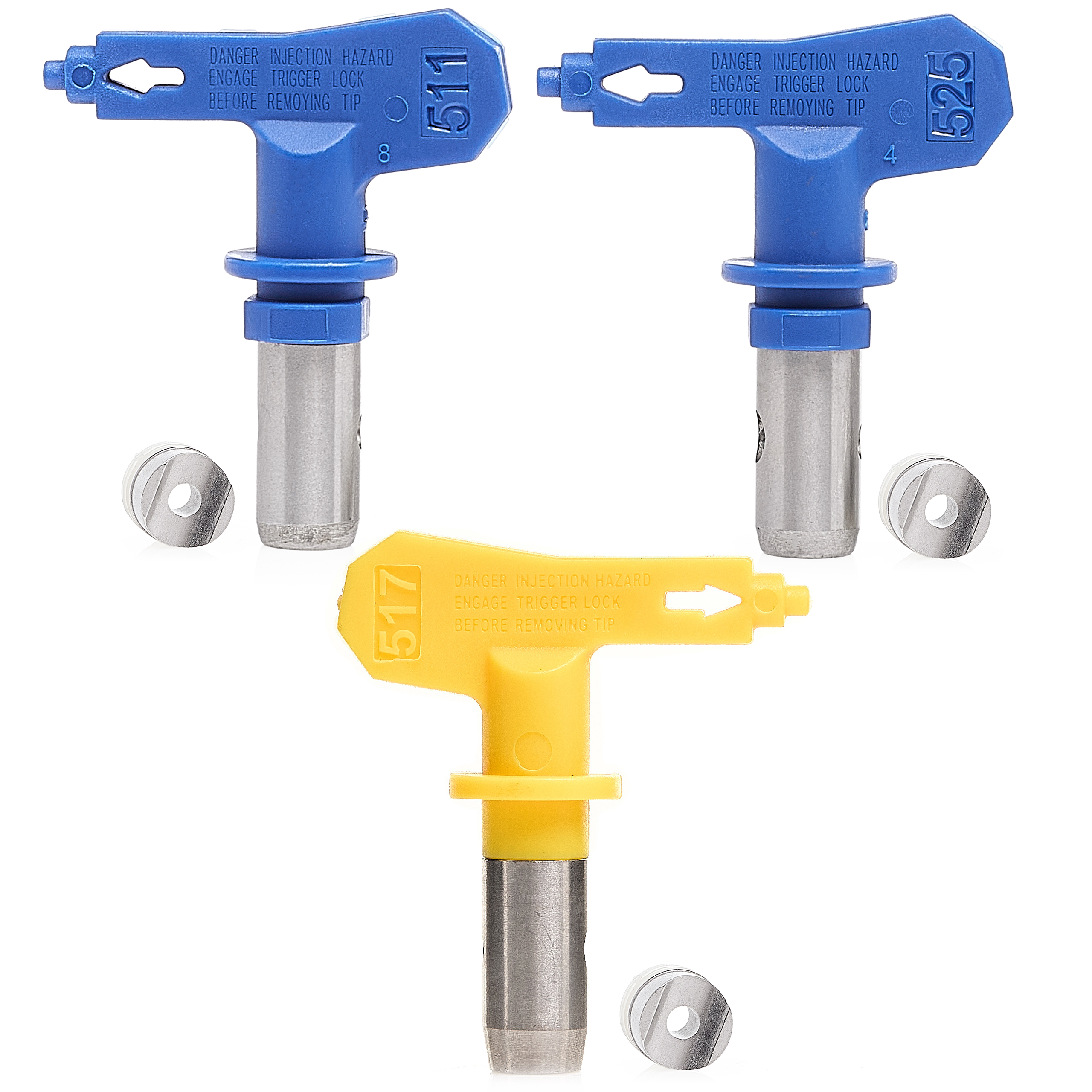 Kompletny zestaw dysz malarskich 511, 517, i 525 oferuje różne kąty rozproszenia i przepływy, co pozwala precyzyjnie dopasować natrysk do rodzaju powierzchni.