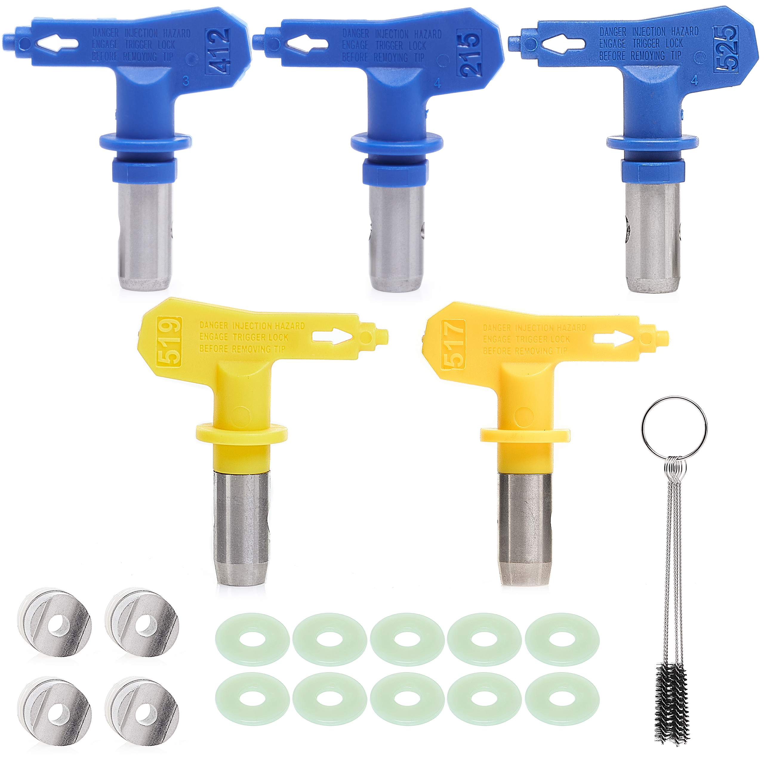 Kompletny zestaw dysz malarskich 517, 215, 412, 519 i 525 oferuje różne kąty rozproszenia i przepływy, co pozwala precyzyjnie dopasować natrysk do rodzaju powierzchni.