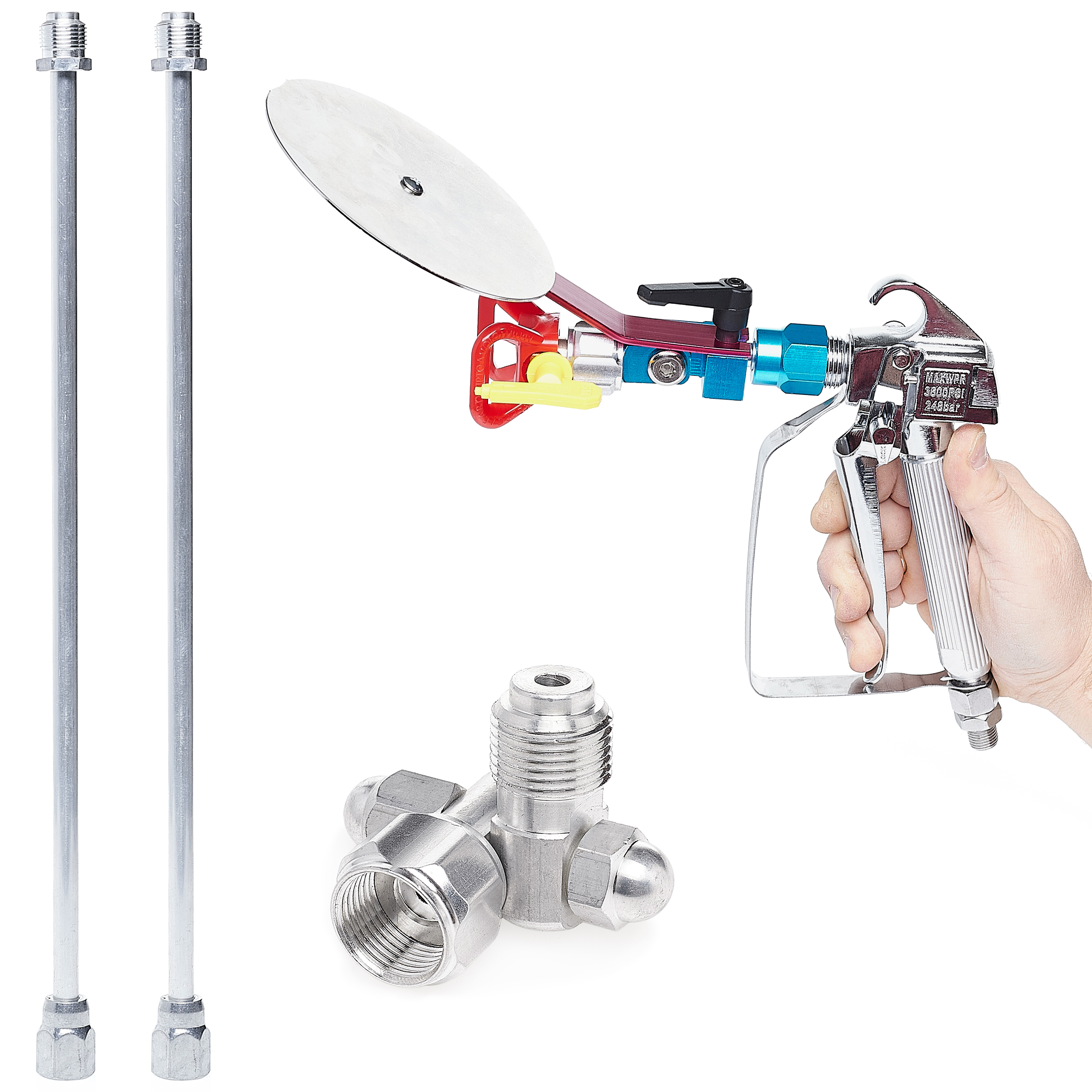 Powyższe akcesoria zapewniają dużo możliwości konfiguracji. Odcinarka pozwoli nam precyzyjnie malować różnymi farbami obok siebie, bez wychodzenia poza docelowy obszar. Złącze obrotowe Clean Shot umożliwia malowanie w trudno dostępnych miejscach dzięki regulacji kątu między lancą a pistoletem malarski. Natomiast dwie lance, które są w zestawie możemy połączyć w jedną o długości 100cm.