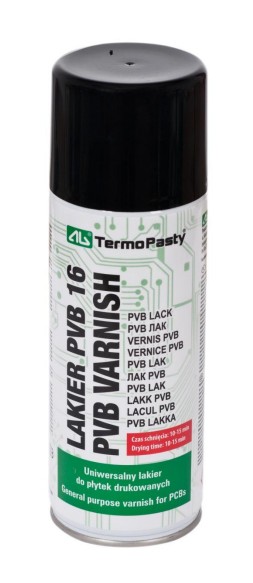 Szybkoschnąca przezroczysta powłoka PVB o dobrych właściwościach izolacyjnych. Zabezpiecza przed korozją płytki drukowane i inne elementy pracujące w niesprzyjających warunkach atmosferycznych. Powłoka chroni płytki drukowane przed powstawaniem prądów błądzących i zwarć. WŁAŚCIWOŚCI: Tworzy zabezpieczającą i izolującą warstwę chroniącą przed wpływami atmosferycznymi takimi jak: wilgoć, utlenianie, pyły, zanieczyszczenia chemiczne; Dobrze przylega do powierzchni metalowych, plastikowych i drewna; Tworzy powłokę odporną na rozcieńczone kwasy, alkalia i czynniki atmosferyczne; Możliwe jest lutowanie przez warstwę lakieru; Zapobiega iskrzeniu i wyładowaniom koronowym; Ogranicza przebicia miedzy ścieżkami; Nie zmienia przejrzystości i elastyczności nawet po długim czasie; Zakres temperatur stosowania: od -40°C +60°C. Temperatura pracy -50°C +150°C. Temperatura zapłonu +380°C.