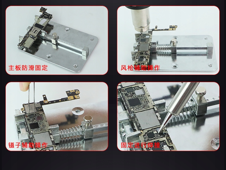 Płyta robocza do naprawy płytek PCB, stosowana najczęściej do pracy z małymi urządzeniami typu smartfony, tablety i inne urządzenia. Wyposażona jest w dwa uchwyty zapewniające pewne mocowanie płytki, a dodatkowa sprężyna zapewnia odpowiedni docisk. Podstawka bardzo stabilna, o wysokiej jakości.Odporna jest na wysoką temperaturę, dlatego można bezpośrednio na niej lutować.