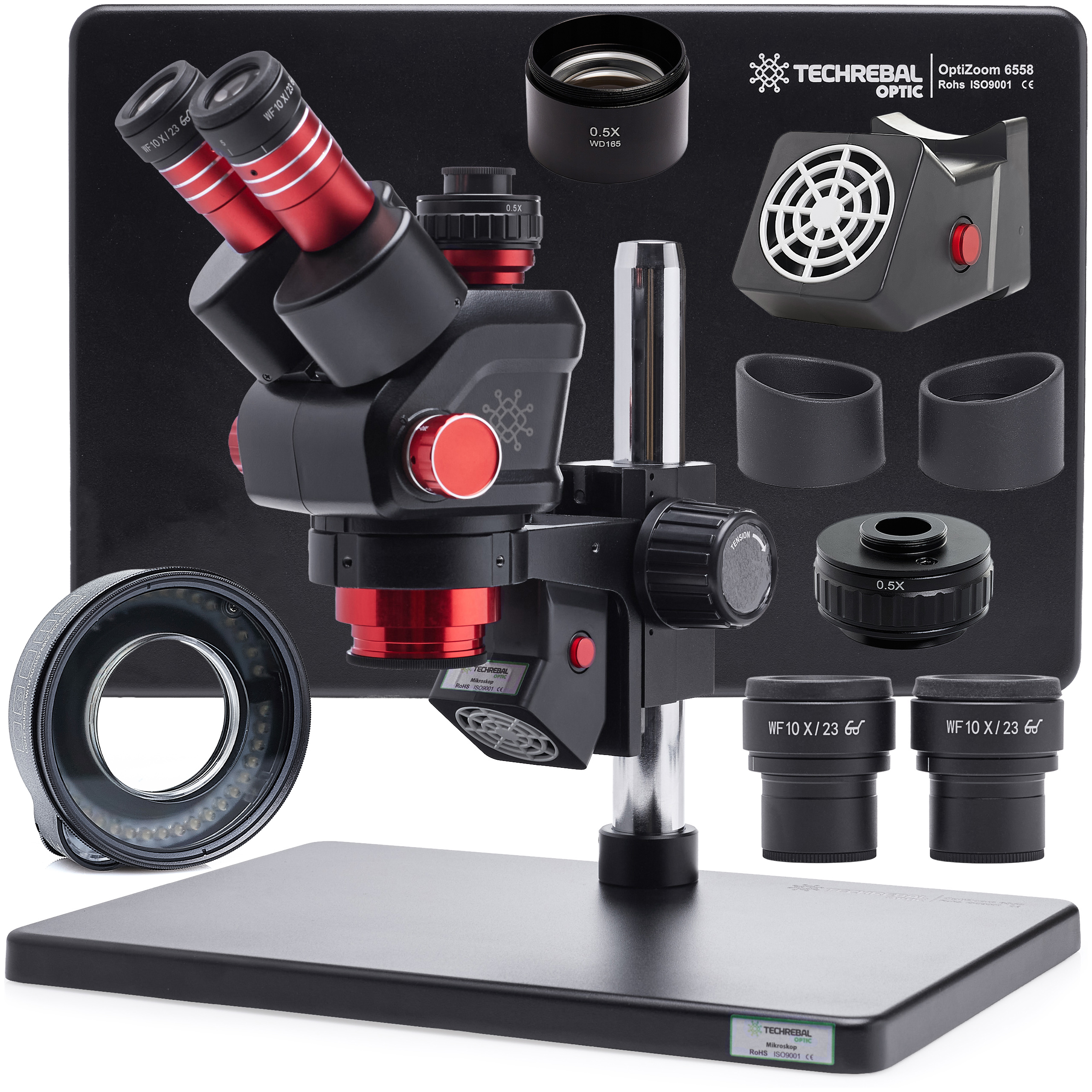 - Mikroskop Stereoskopowy Techrebal OptiZoom 6558: Głowica trinokularowa z płynnym zoomem 6,5x - 58x.