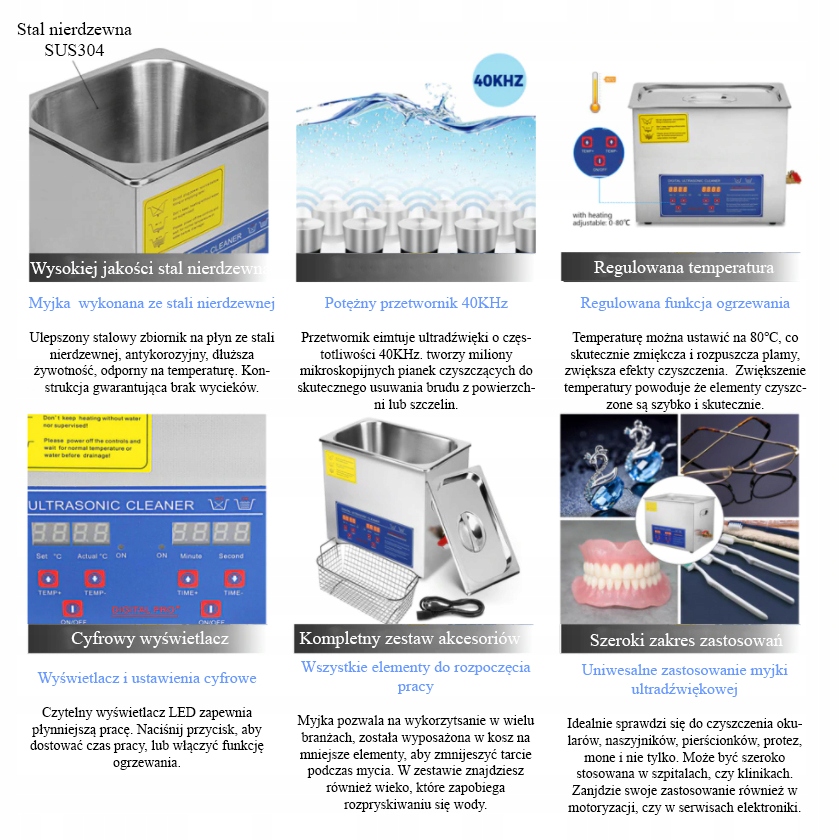 Myjka ultradźwiękowa o pojemności 6L, idealna do czyszczenia, konserwacji. Stosowana przez elektroników, jubilerów, optyków, fryzjerów, gabinety kosmetyczne, modelarzy i wielu innych. Drgania fal ultradźwiękowych usuwają zanieczyszczenia z powierzchni. Możliwe jest czyszczenie biżuterii, okularów, szkła, zegarków oraz dóbr konsumpcyjnych takich jak: głowice golące, protezy dentystycznej, artykuły piśmienne, wyroby metalowe i więcej.