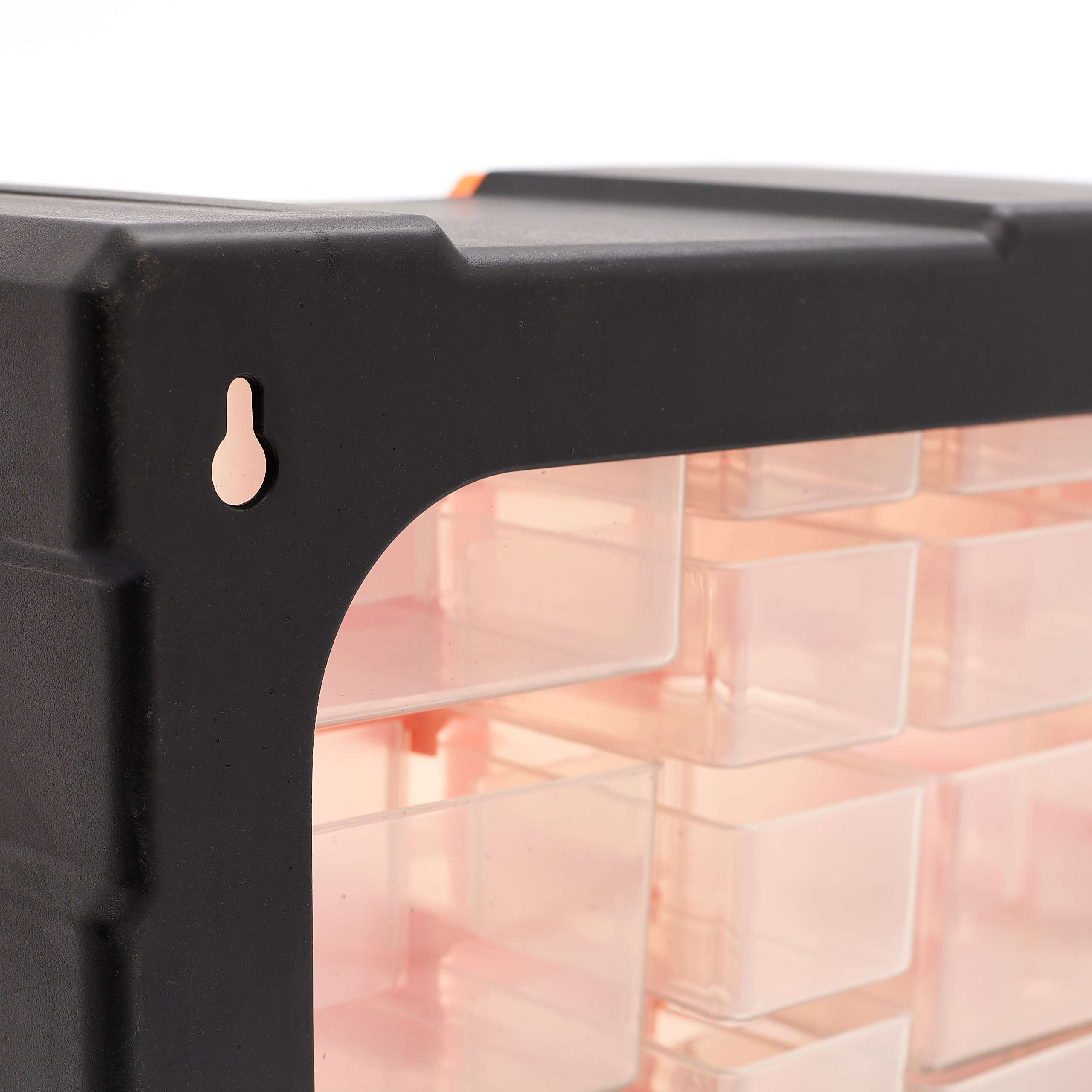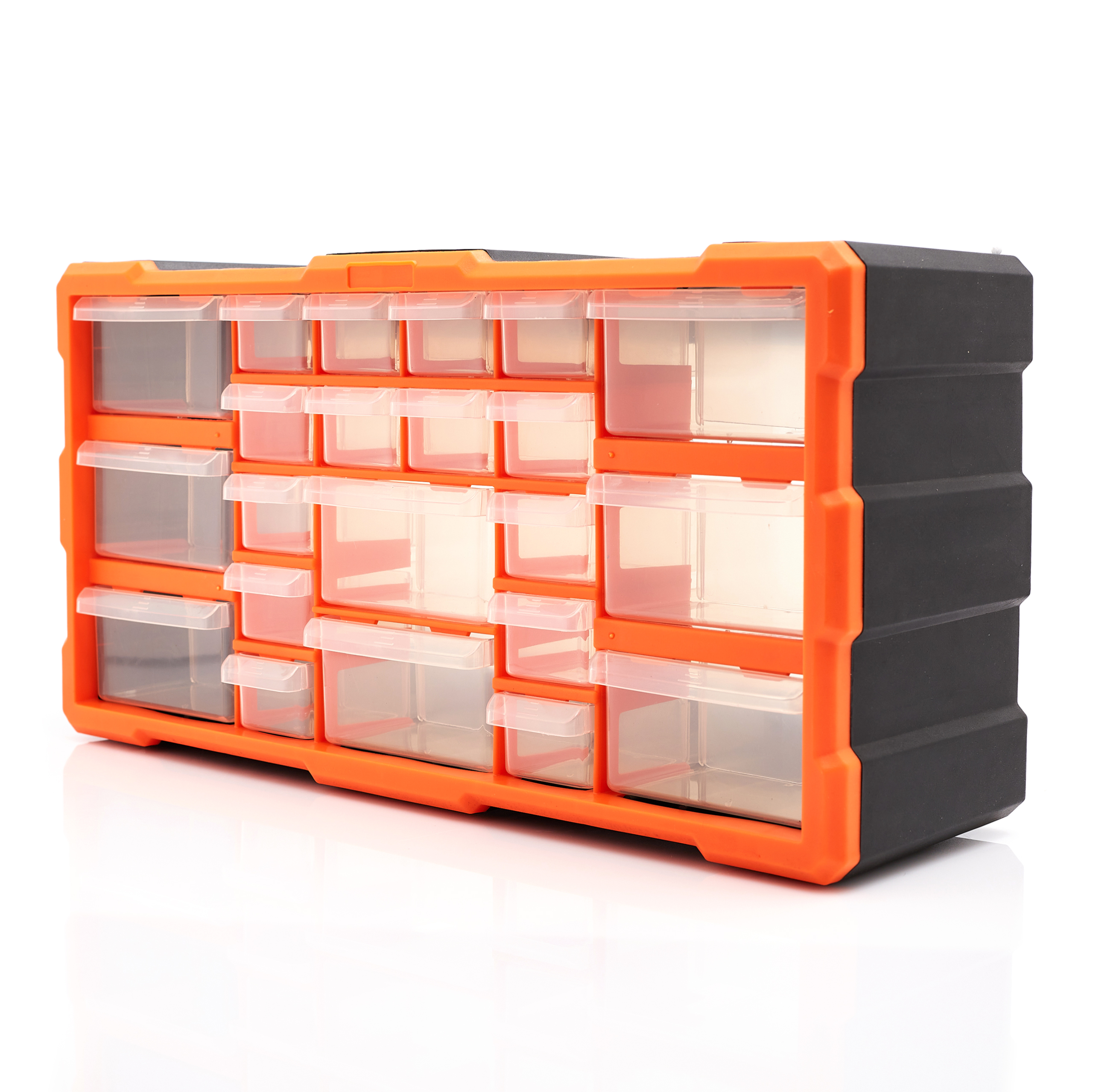 Organizer warsztatowy wyposażony w 22 szufladki. Posiada możliwość zawieszenia na ścianie lub postawienia. Zastosowanie czystego tworzywa (nie przemiału) zapewnia stabilność, trwałość konstrukcji korpusu oraz idealną przejrzystość szufladek. Nadaje się do zastosowań profesjonalnych jak i hobbystycznych.