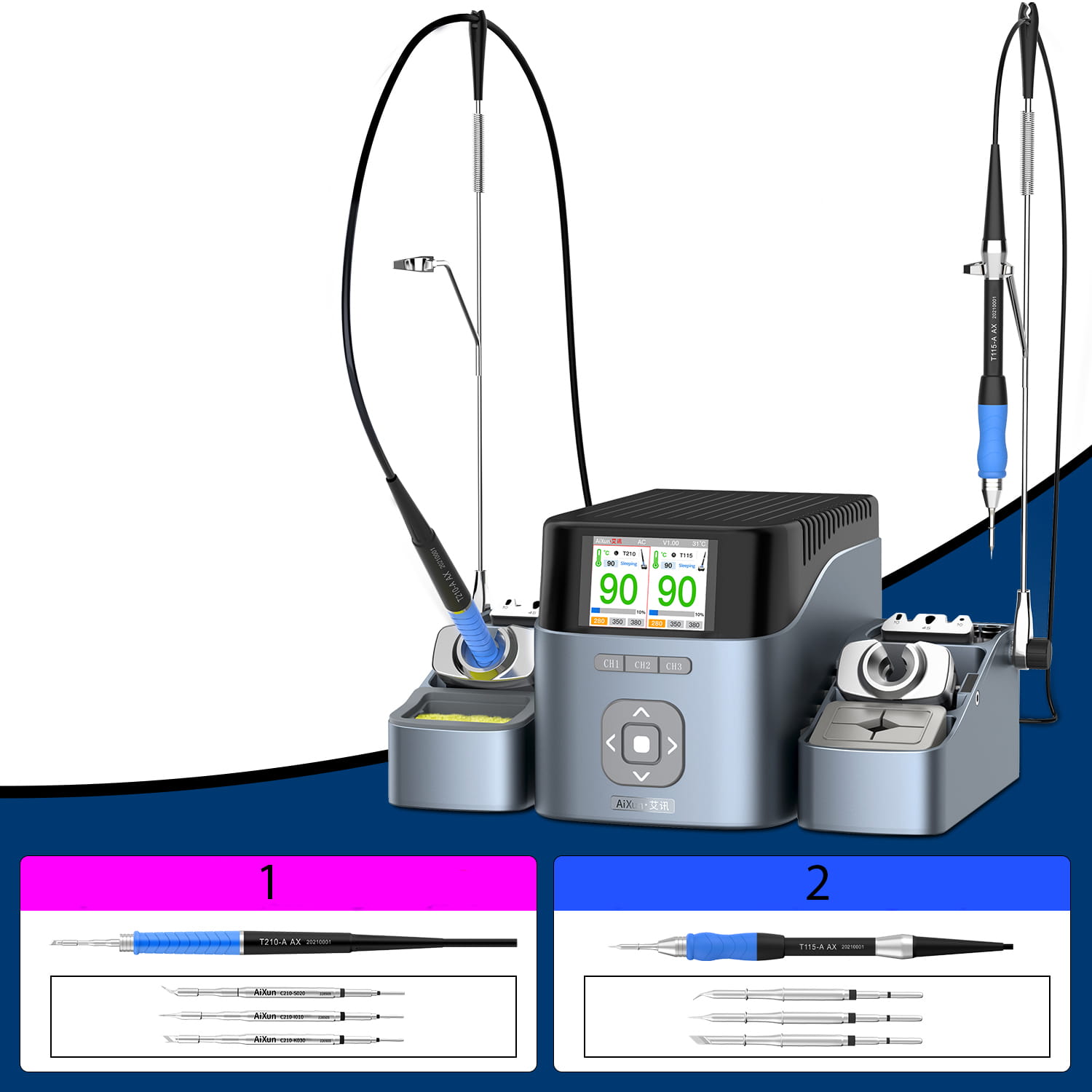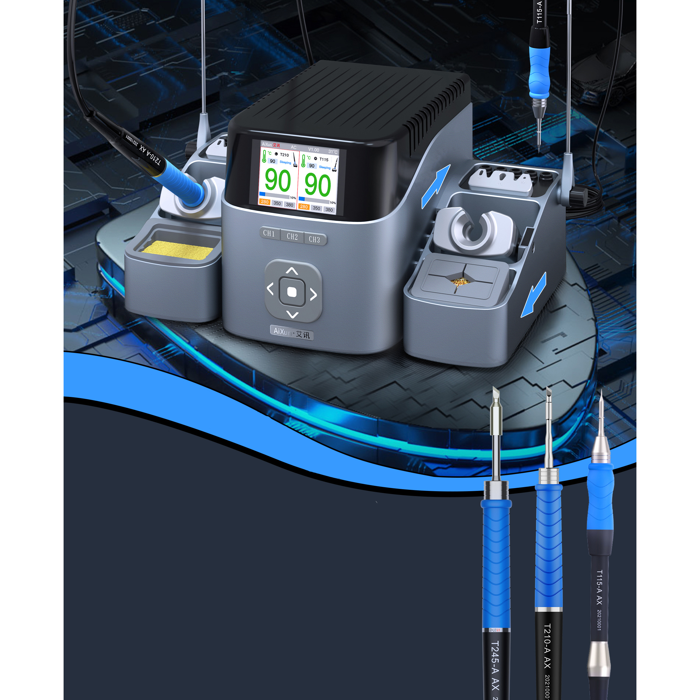 Podwójna precyzyjna stacja lutownicza Aixun (T210+T115+T245) T420D w zestawie z 9 grotami (K,S,I)