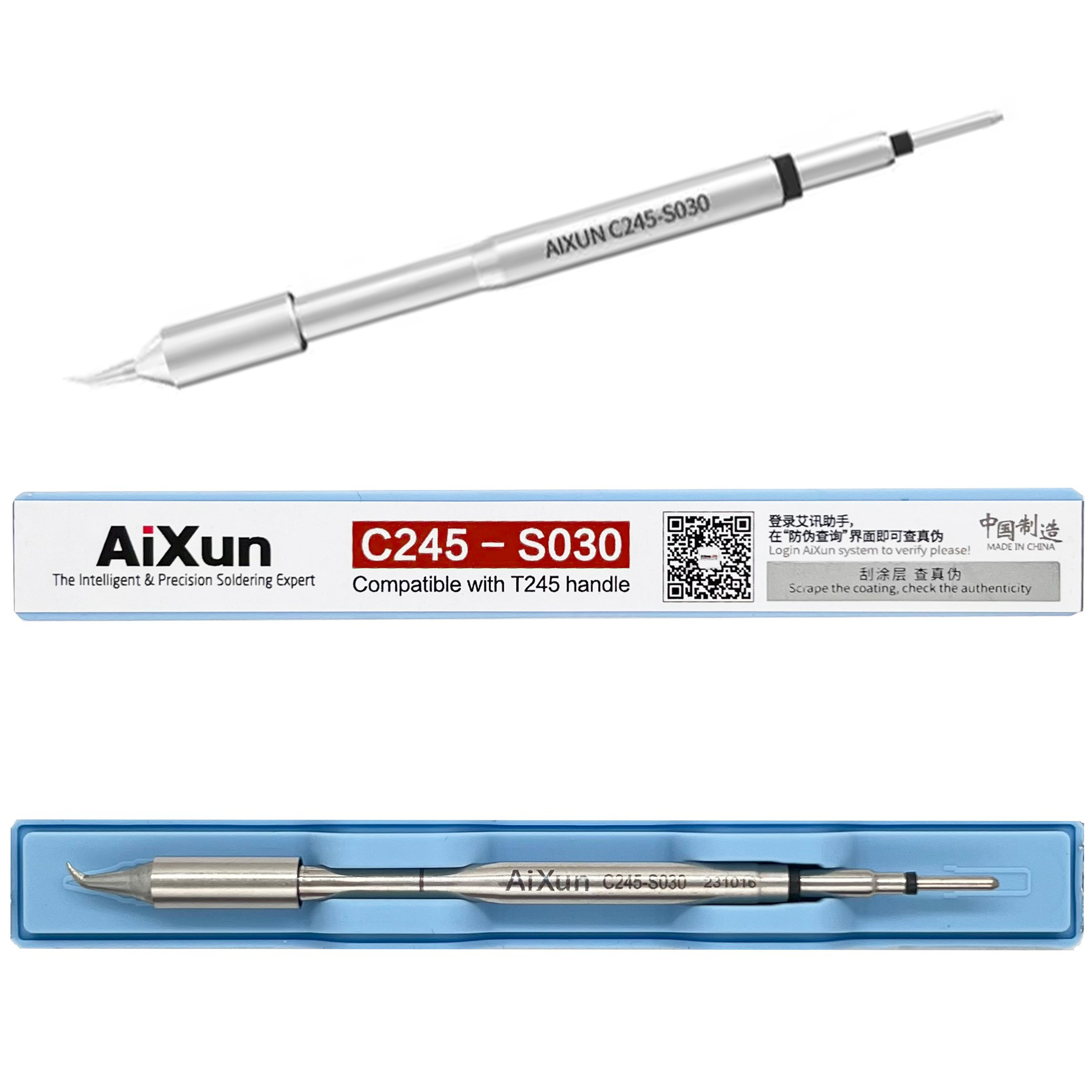 Grot Aixun C245-S030 zagięty typ S 0,3mm do lutownic oraz stacji lutowniczych YIHUA, JBC, I2C, AIXUN, SUGON, BAKON oraz wielu innych posiadających kolby na groty C245.