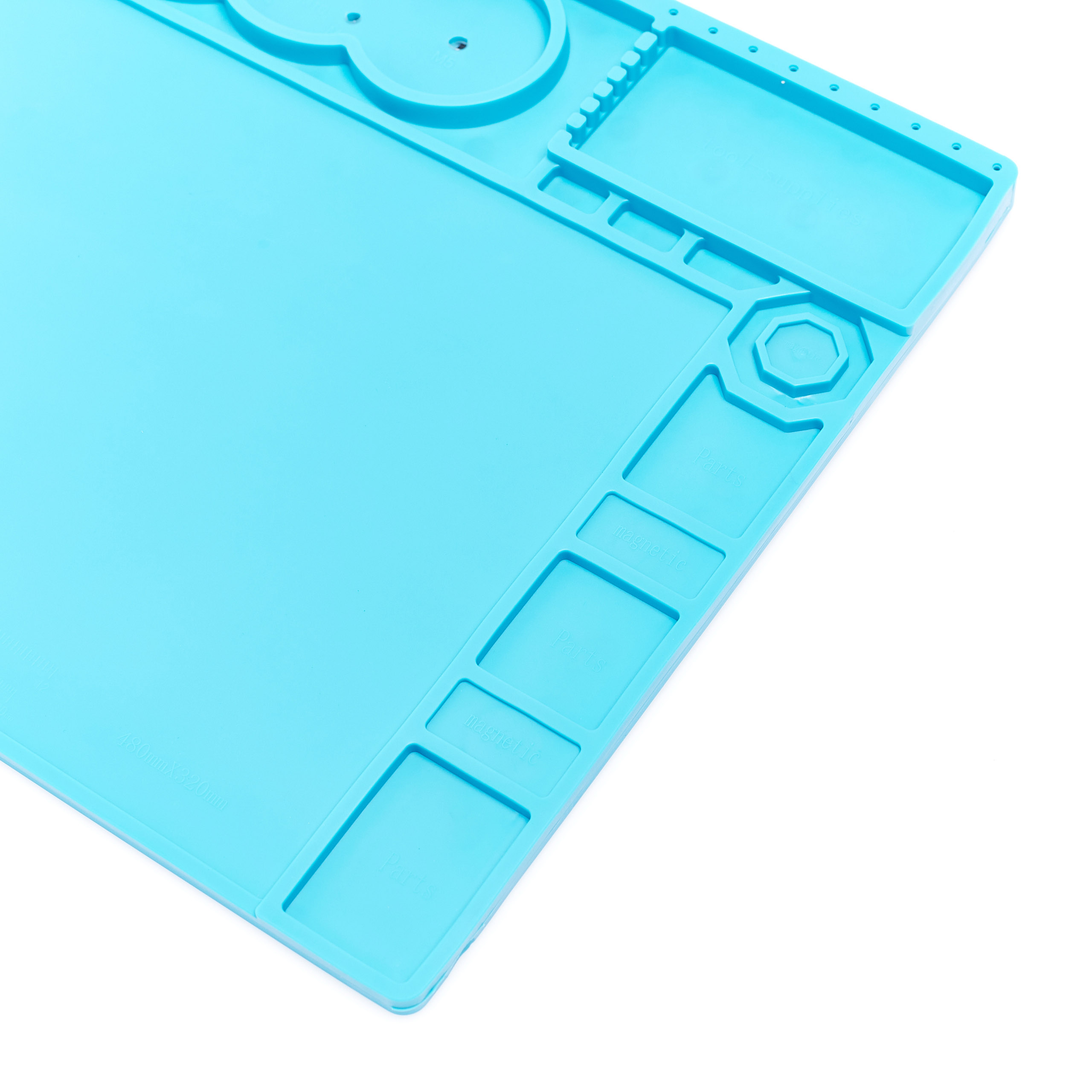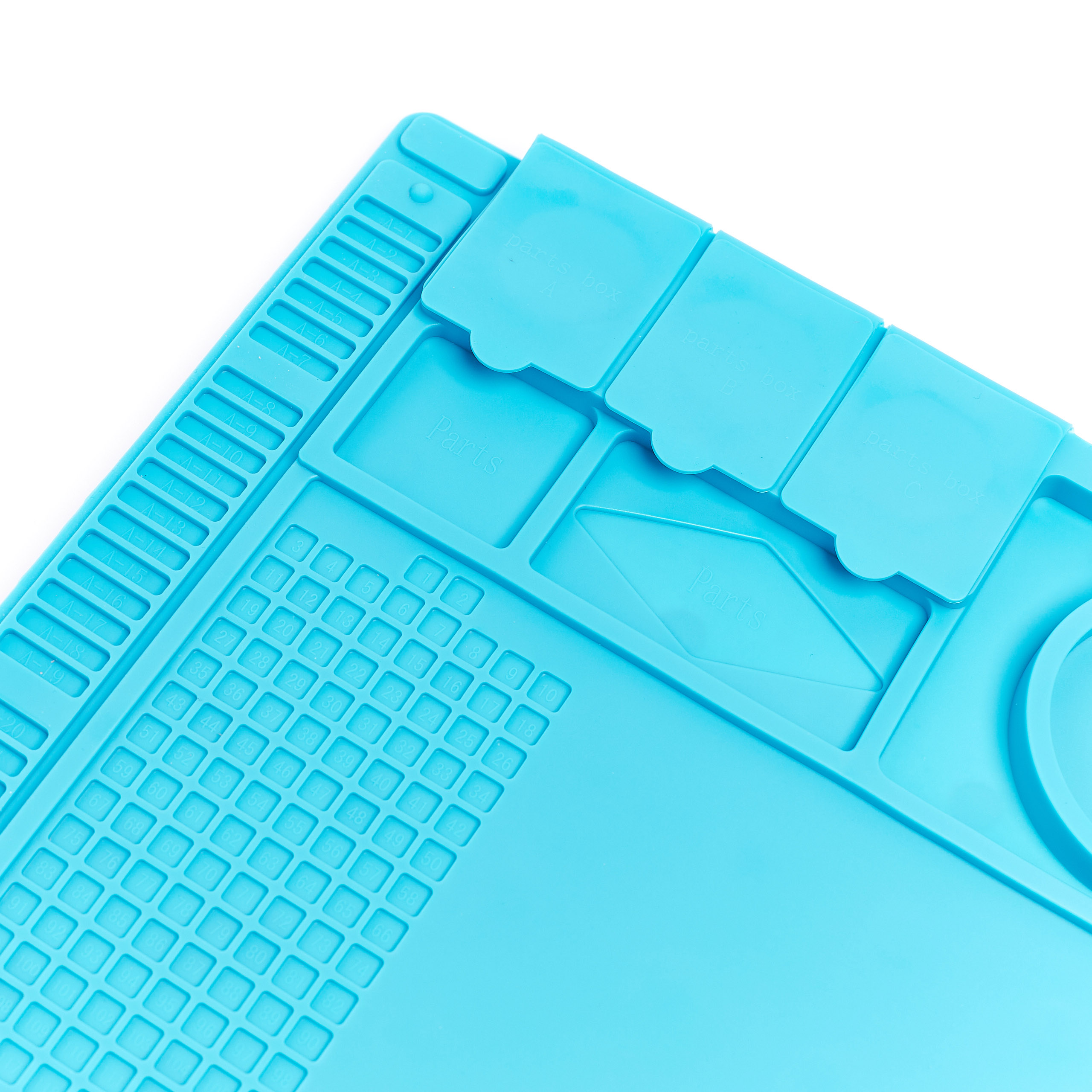 Wysokiej jakości mata silikonowa z wyprofilowanymi przegródkami poprawiająca komfort pracy w każdym serwisie. Antystatyczne właściwości oraz specjalne przegrody umożliwiają organizowanie i segregację elementów elektronicznych, śrubek itp. podczas pracy. Duża płaska powierzchnia oraz odporność na wysoką temperaturę pozwala na lutowanie płyt, ekranów położonych bezpośrednio na macie. Mata odporna na bardzo wysoką temperaturę do 500 ° C, pozwala na lutowanie bezpośrednio na niej. Wyposażona została w kilka różnych przegródek gdzie można umieścić np. śrubokręty, śruby, topniki, cynę, oraz inne małe elementy wykorzystywane w serwisie. Idealnie sprawdzi się do serwisów zajmujących się naprawą telefonów komórkowych, tabletów, komputerów, oraz innych miejsc gdzie potrzebna jest porządna mata antystatyczna z odpornością na wysoką temperaturę. Matę można czyścić wodą, alkoholem izopropylowym, lub innym płynem do czyszczenia płyt PCB. Mata została wyposażona w sekcje magnetyczną co pozwala na utrzymanie swojego miejsca pracy w idealnym porządku, wszystkie śrubki, czy inne metalowe komponenty będą w jednym miejscu. Mata, dzięki otworom montażowym idealnie sprawdzi się do montażu mikroskopu (3 otwory montażowe (śruby 4mm - brak w zestawie) W macie umieszczono metalową podstawę, która dodatkowo zapewnia stabilność, jest to zapewne najlepsza i najbardziej trwała mata wśród dostępnych na rynku.