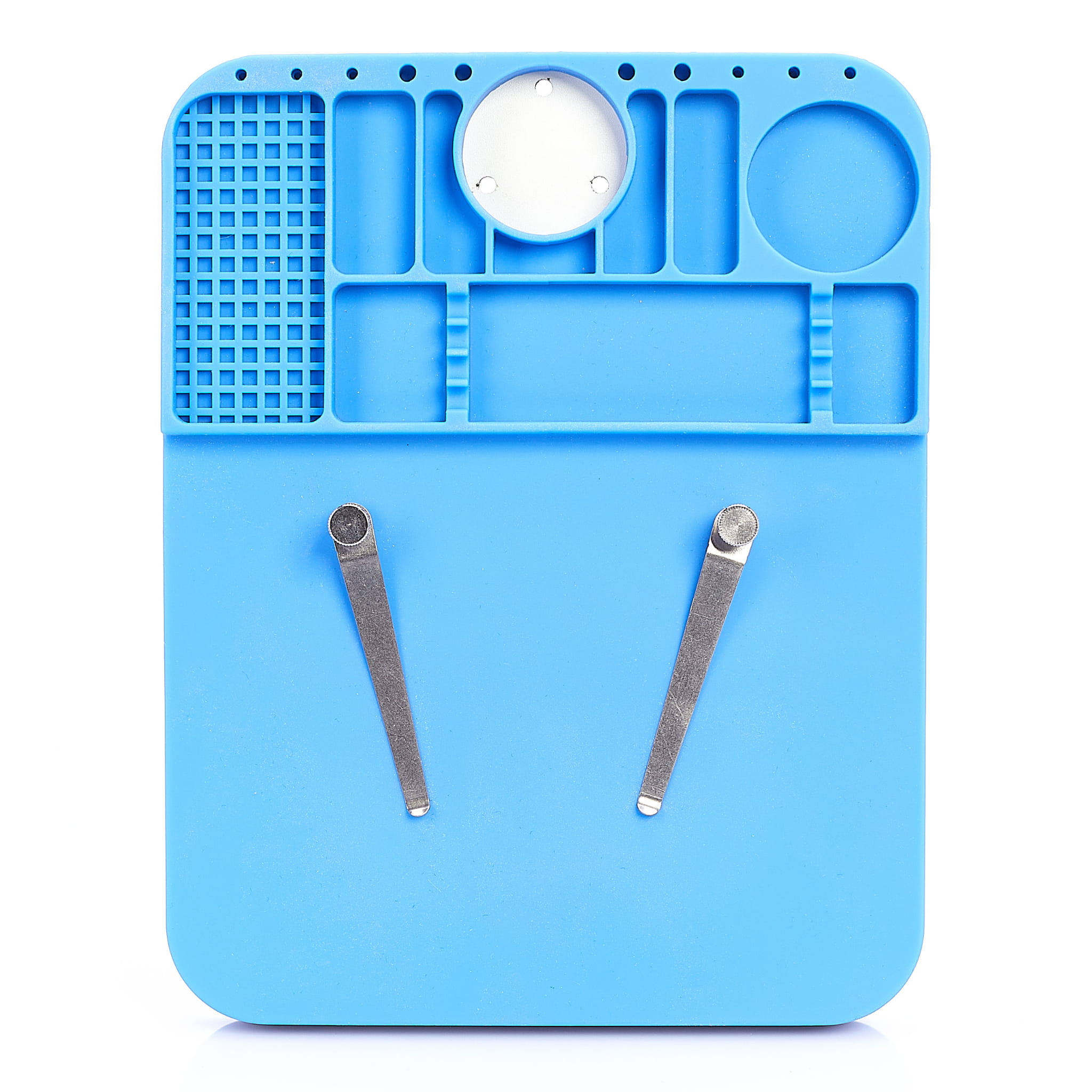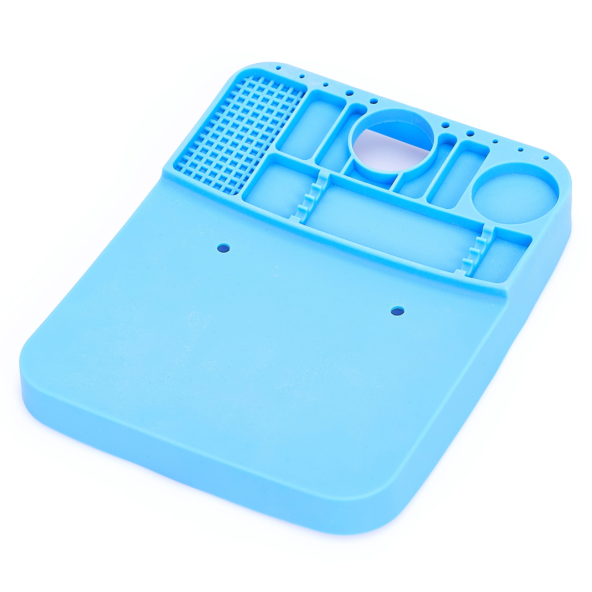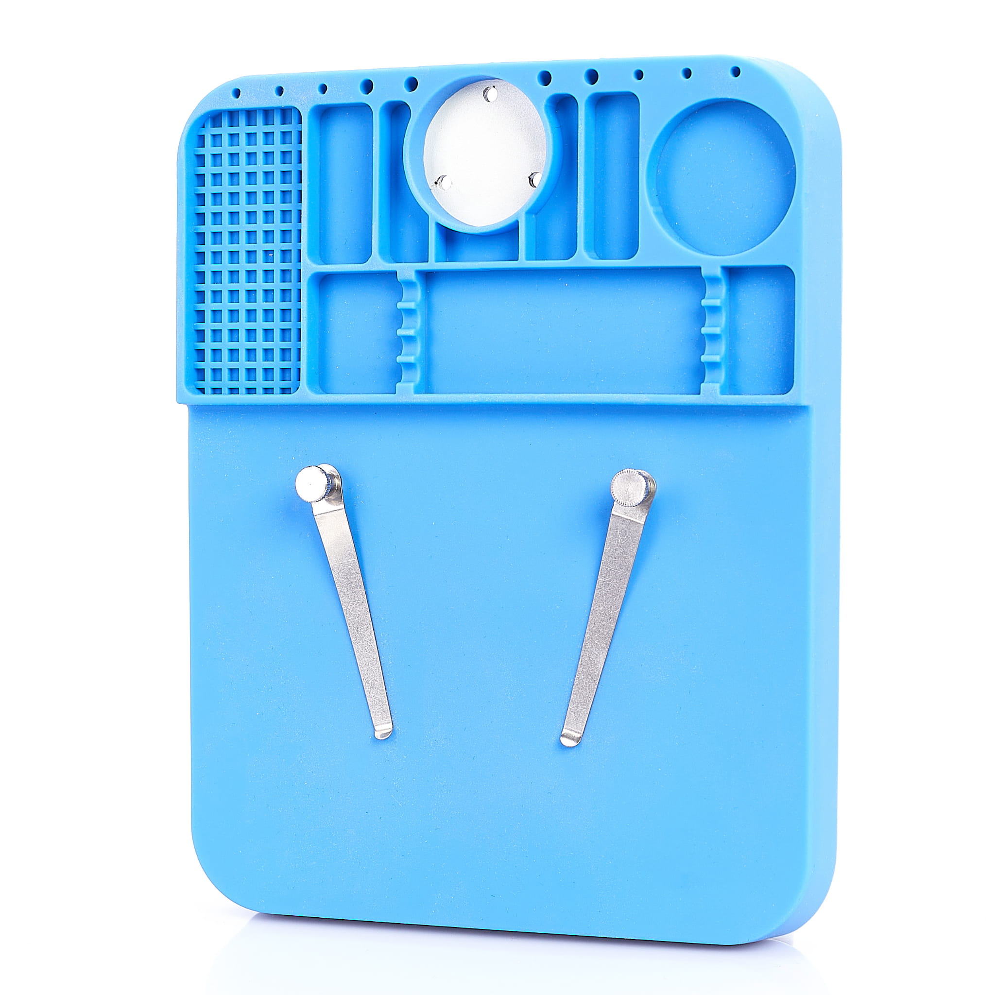 Wysokiej jakości mata silikonowa z wyprofilowanymi przegródkami poprawiająca komfort pracy w każdym serwisie. Antystatyczne właściwości oraz specjalne przegrody umożliwiają organizowanie i segregację elementów elektronicznych, śrubek itp. podczas pracy. Duża płaska powierzchnia oraz odporność na wysoką temperaturę pozwala na lutowanie płyt, ekranów położonych bezpośrednio na macie. Mata odporna na bardzo wysoką temperaturę do 500 ° C, pozwala na lutowanie bezpośrednio na niej. Wyposażona została w wiele różnych przegródek gdzie można umieścić np. śrubokręty, śruby, topniki, cynę, oraz inne małe elementy wykorzystywane w serwisie. Idealnie sprawdzi się do serwisów zajmujących się naprawą telefonów komórkowych, tabletów, komputerów, oraz innych miejsc gdzie potrzebna jest porządna mata antystatyczna z odpornością na wysoką temperaturę. Matę można czyścić wodą, alkoholem izopropylowym, lub innym płynem do czyszczenia płyt PCB.