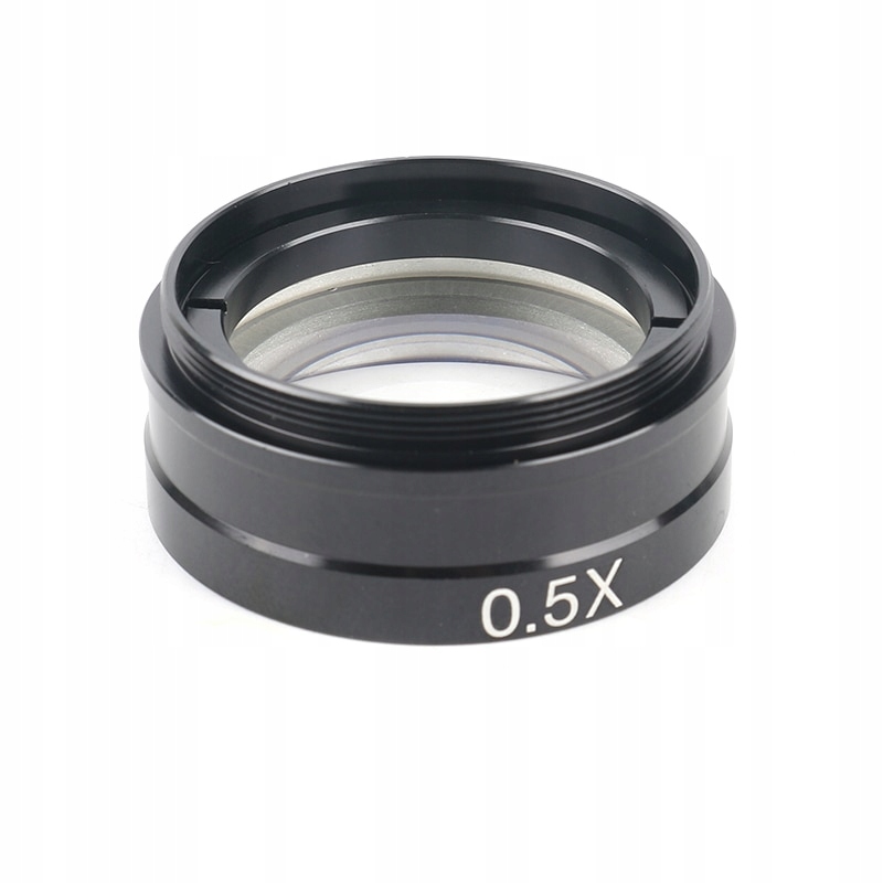 Obiektyw 0,5x do mikroskopów cyfrowych z naszej oferty. Służy do zwiększania przestrzeni roboczej (równocześnie powiększenie mikroskopu zmniejsza się o wartość soczewki w tym przypadku o połowe). Obiektyw montowany jest poprzez gwint na spodniej części głowicy mikroskopu.