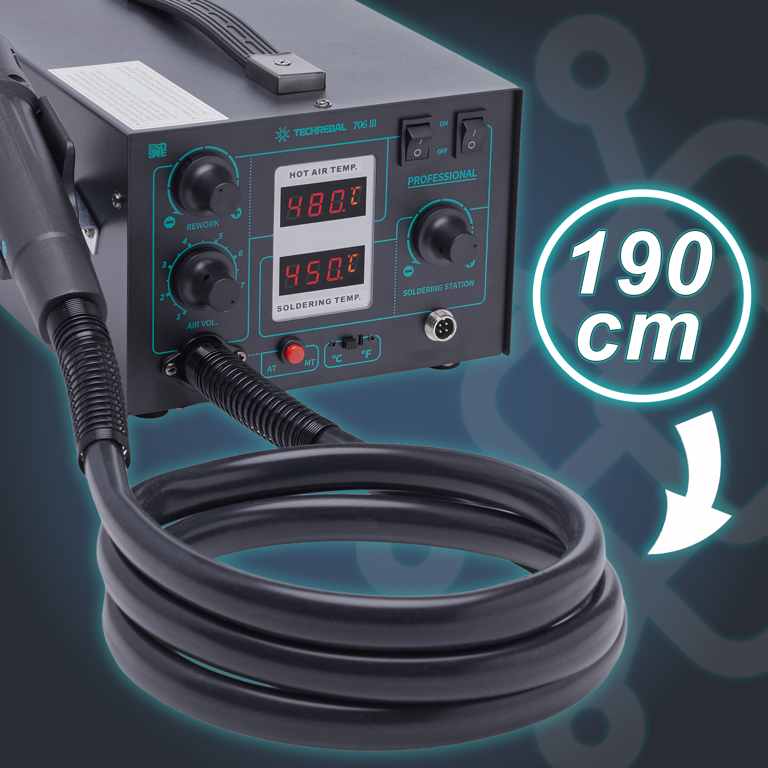 Dzięki długim przewodom – 190 cm dla hot air oraz 100 cm dla lutownicy – praca ze stacją Techrebal 706 III staje się wyjątkowo komfortowa i elastyczna. Niezależnie od wielkości płytki czy ułożenia stanowiska, masz pełną swobodę poruszania się bez konieczności przestawiania stacji.
