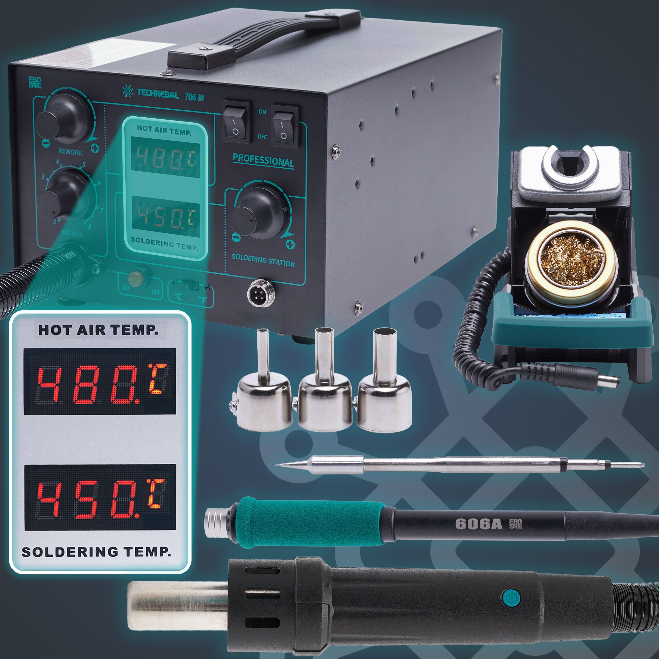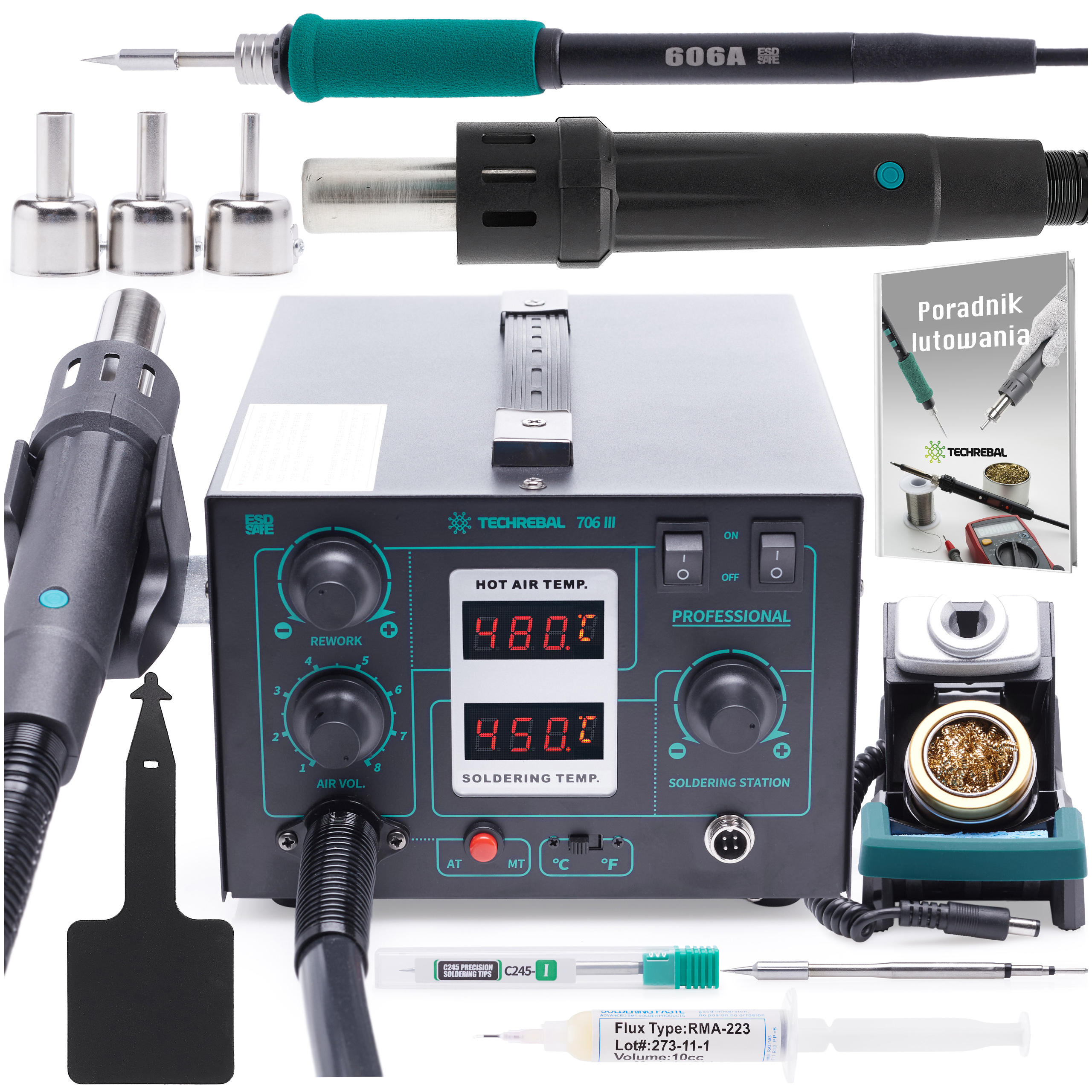 STACJA LUTOWNICZA 2W1 HOT AIR TECHREBAL 706 III 720W LUTOWNICA GROTY C245