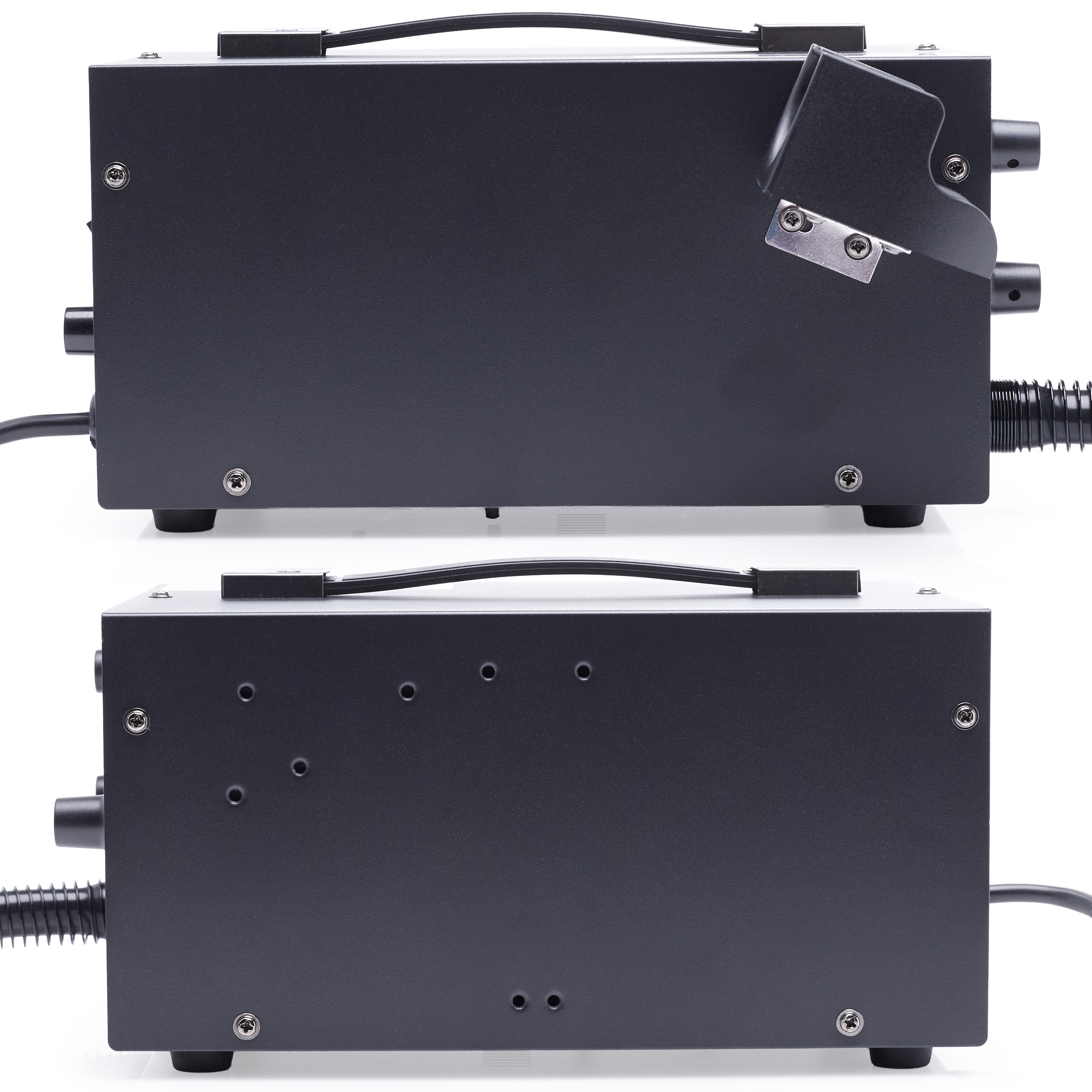W górnej części znajduje się praktyczny uchwyt transportowy ułatwiający przenoszenie stacji, a z boku zamontowano metalowy uchwyt do kolby hot air, który umożliwia bezpieczne odkładanie narzędzia po zakończeniu pracy. Wszystkie elementy zostały solidnie zamocowane, co przekłada się na długą żywotność i niezawodność urządzenia nawet przy intensywnym użytkowaniu.