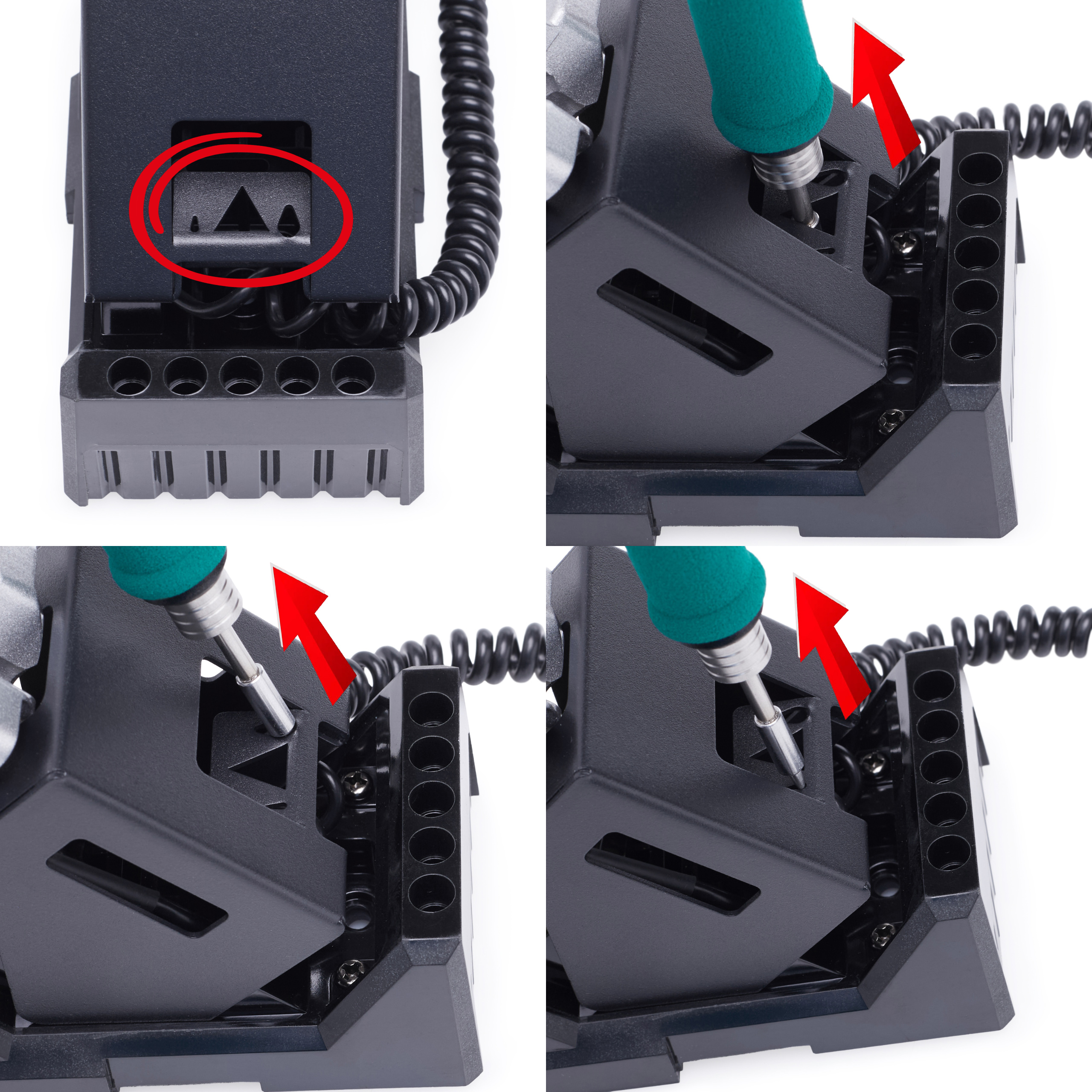 ✅ Stabilna podstawka pod kolbę lutownicy wyposażona jest w organizer na 5 grotów i uchwyt ułatwiający bezpieczny montaż i demontaż końcówki, co zwiększa wygodę użytkowania i chroni elementy przed przypadkowym uszkodzeniem.