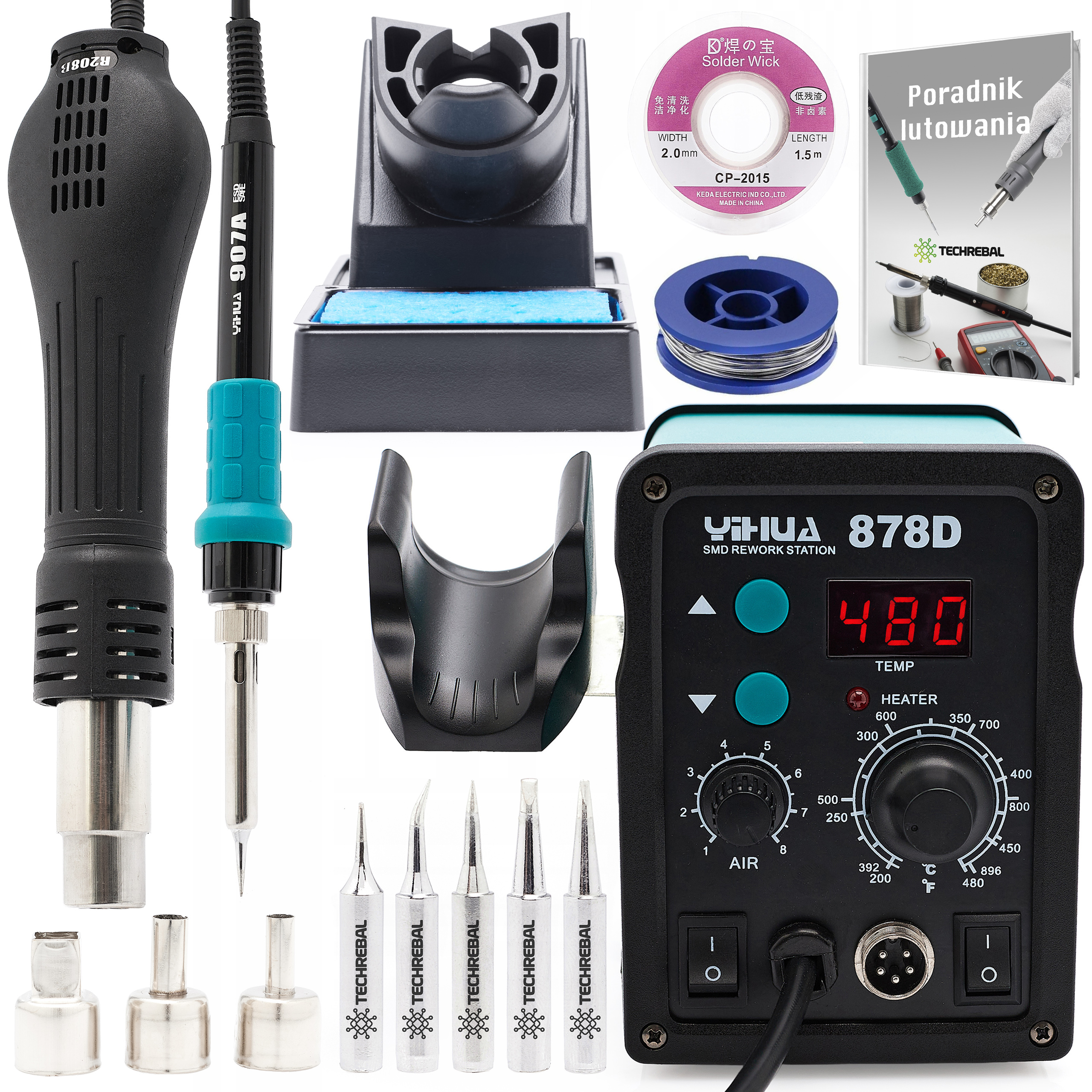 STACJA LUTOWNICZA 2w1 Hot Air kolbowa gorące powietrze Yihua 878D MOCNA 6 Grotów 3 Dysze Plecionka Cyna Poradnik Lutowania