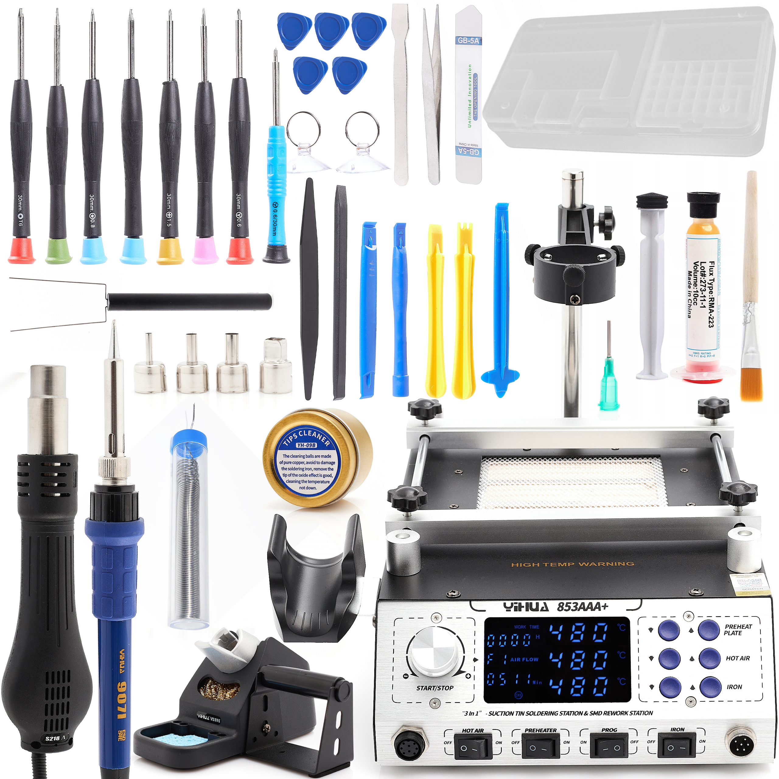 Stacja lutownicza 3w1 Yihua 853AAA+ + Zestaw narzędzi do naprawy GSM 25w1 + podwójny box + cyna + topnik + pędzelek