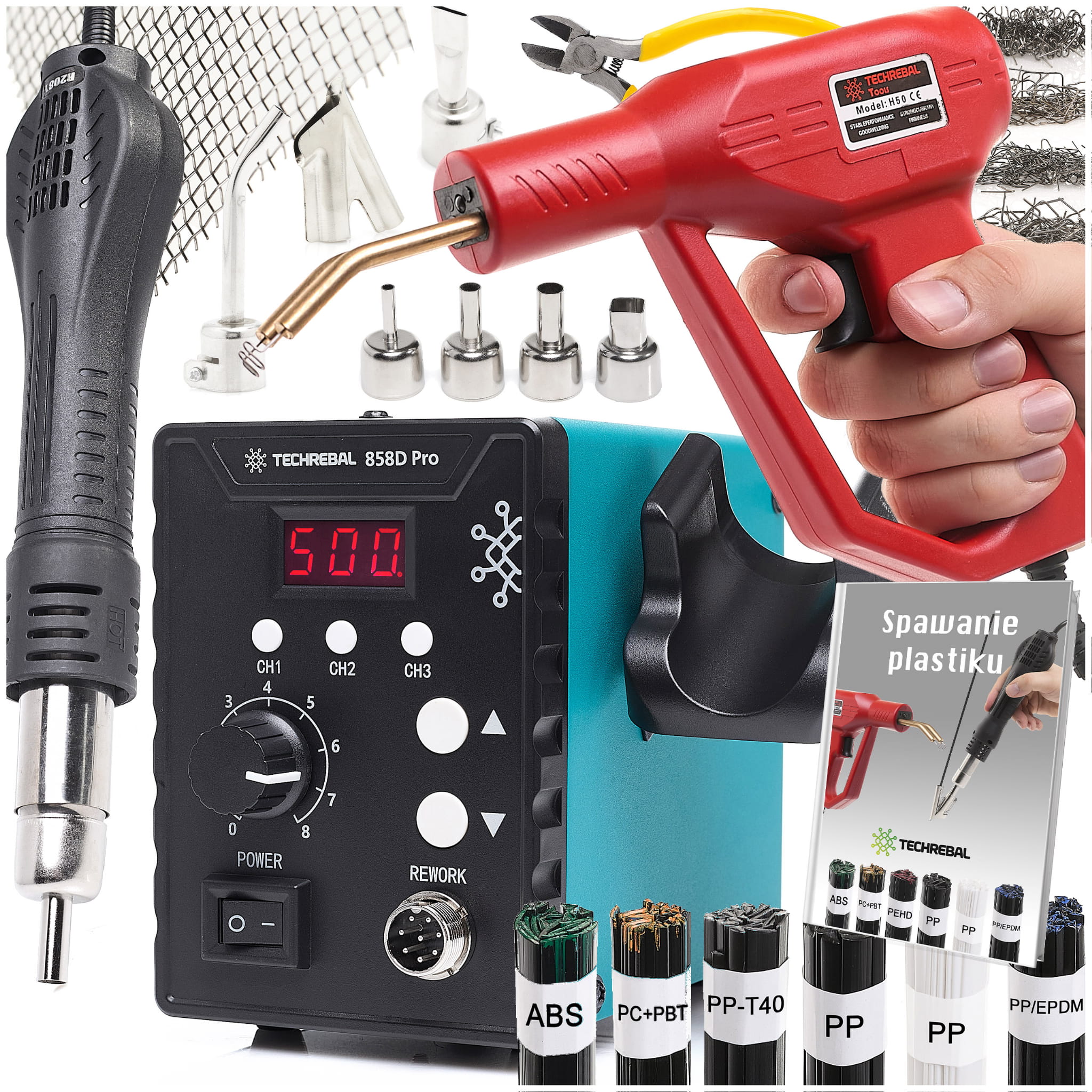 W zestawie znajduje się: Spawarka Techrebal 858D Ultra, Zszywacz plastiku H50, 6 dysz, dysza BUT, siatka elastyczna 20x12,5cm, 6 spoiw po 50g: PP, PP białe, ABS, PC+PBT, PP-T40, PP/EPDM, zszywki 200 szt., szczypce, nożyk + GRATIS Poradnik Spawania plastiku - w wersji elektronicznej