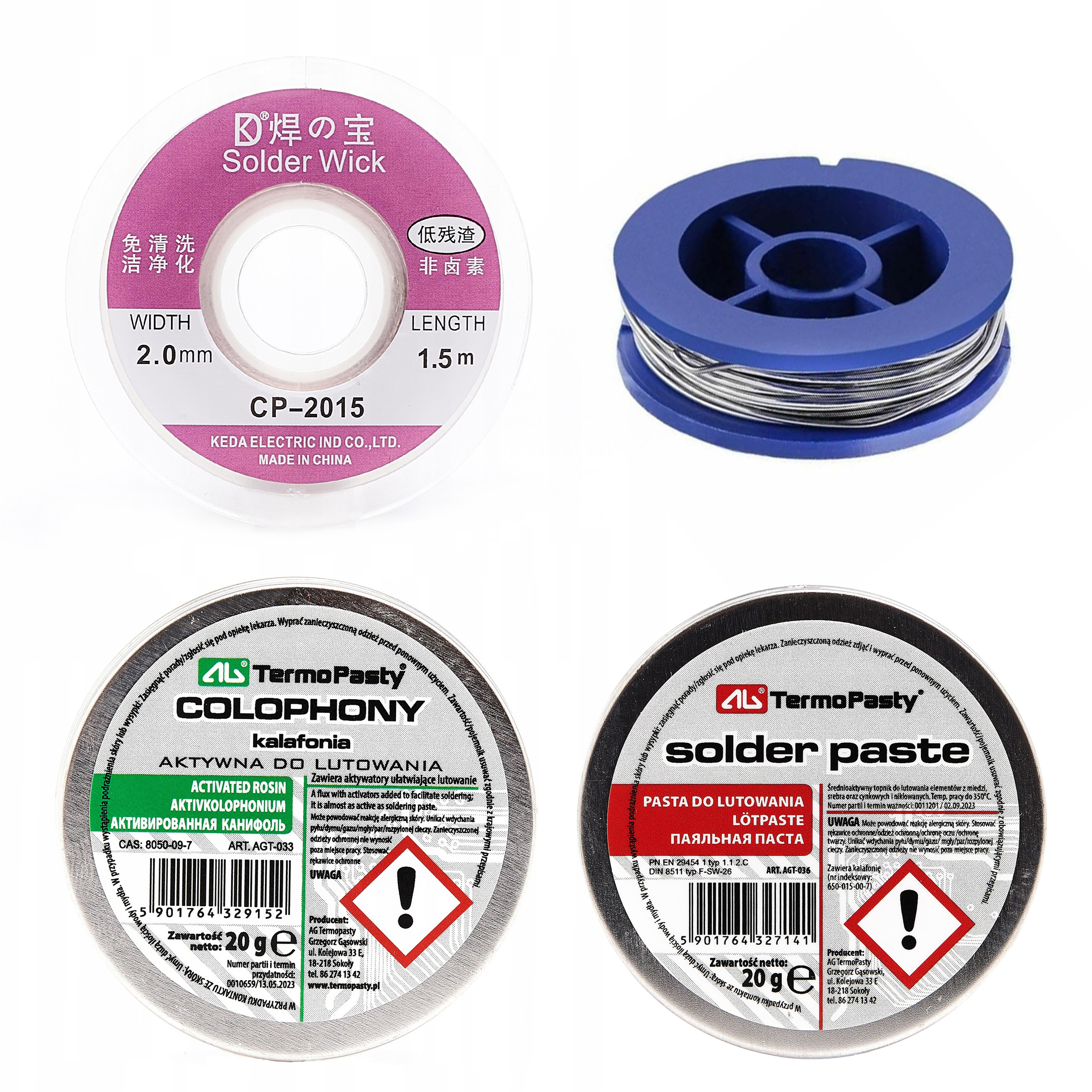 Pasta lutownicza (20g), Kalafonia (20g), Cyna 0,8mm 7g, Plecionka rozlutownicza do cyny 2mm - Dopełniają zestaw o wszystkie akcesoria dzięki którym od razu można zabrać się do lutowania!