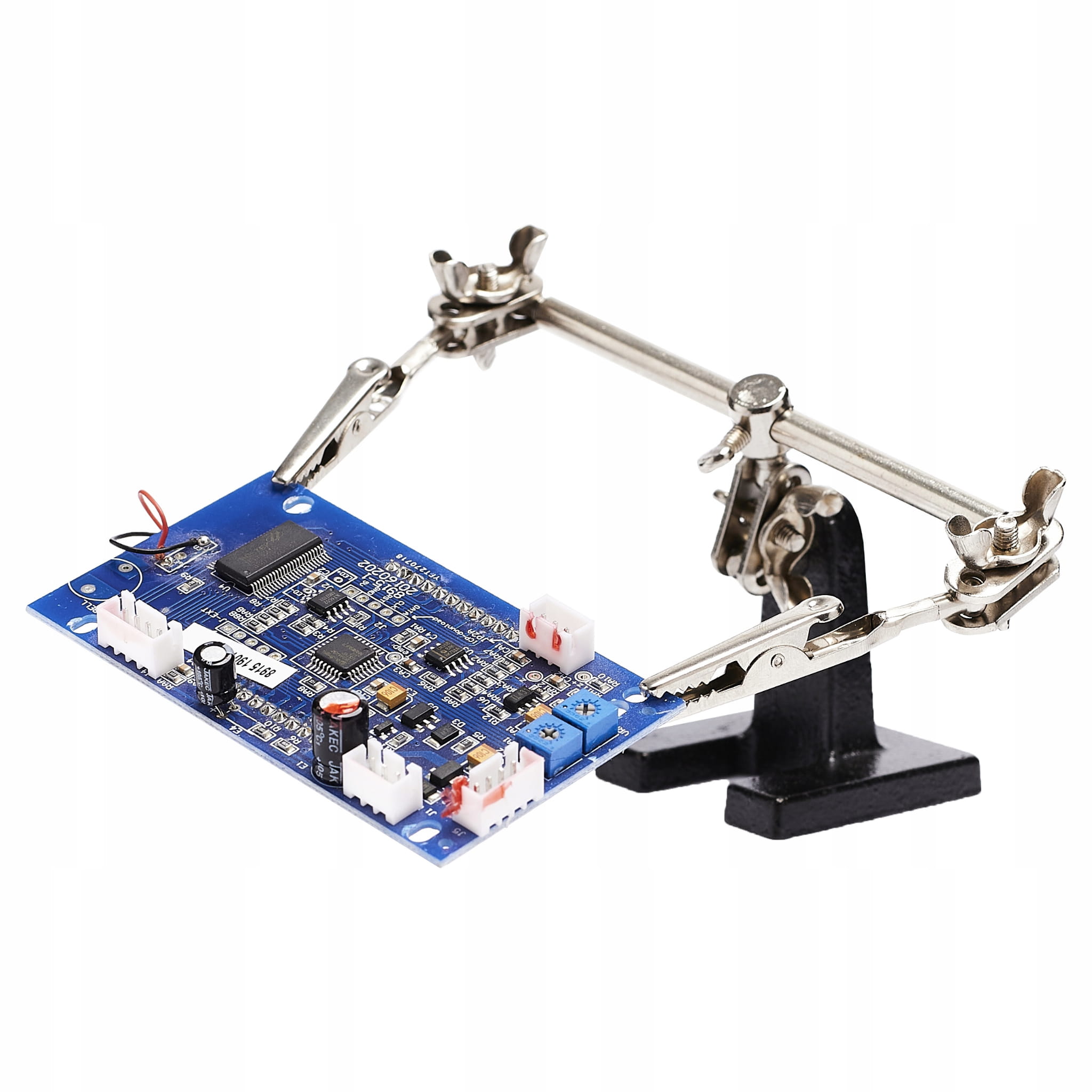Doskonale sprawdzi się podczas wszelkich prac precyzyjnych, w jubilerstwie, modelarstwie.Idealne narzędzie do lutowania oraz wszędzie tam, gdzie brakuje "trzeciej ręki".Uchwyt wyposażony w dwa zaciski typu "krokodylek",regulowane pod różnym kątem i rozstawie, trzecia ręka wyposażona została w żeliwną podstawę dzięki czemu praca jest stabilna.