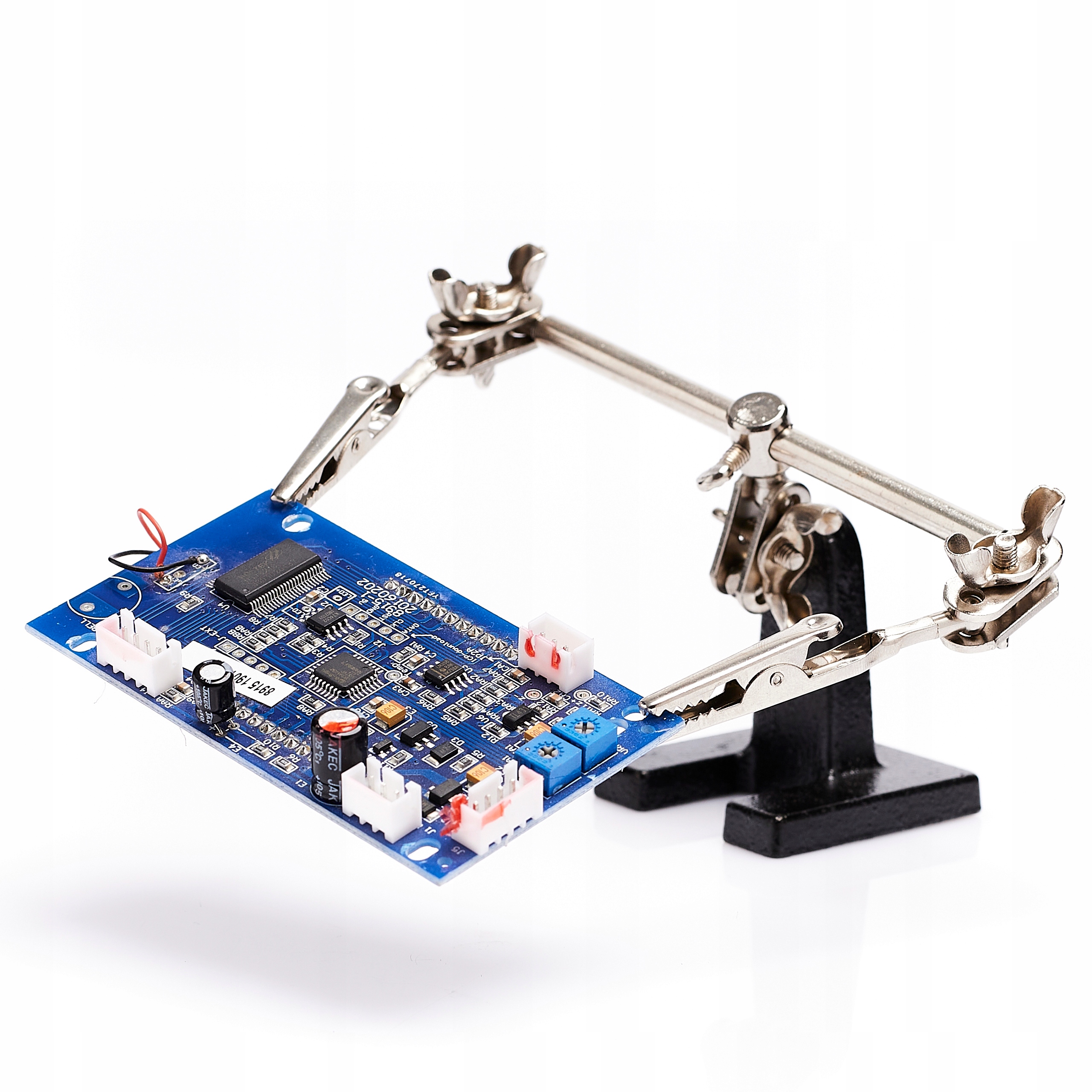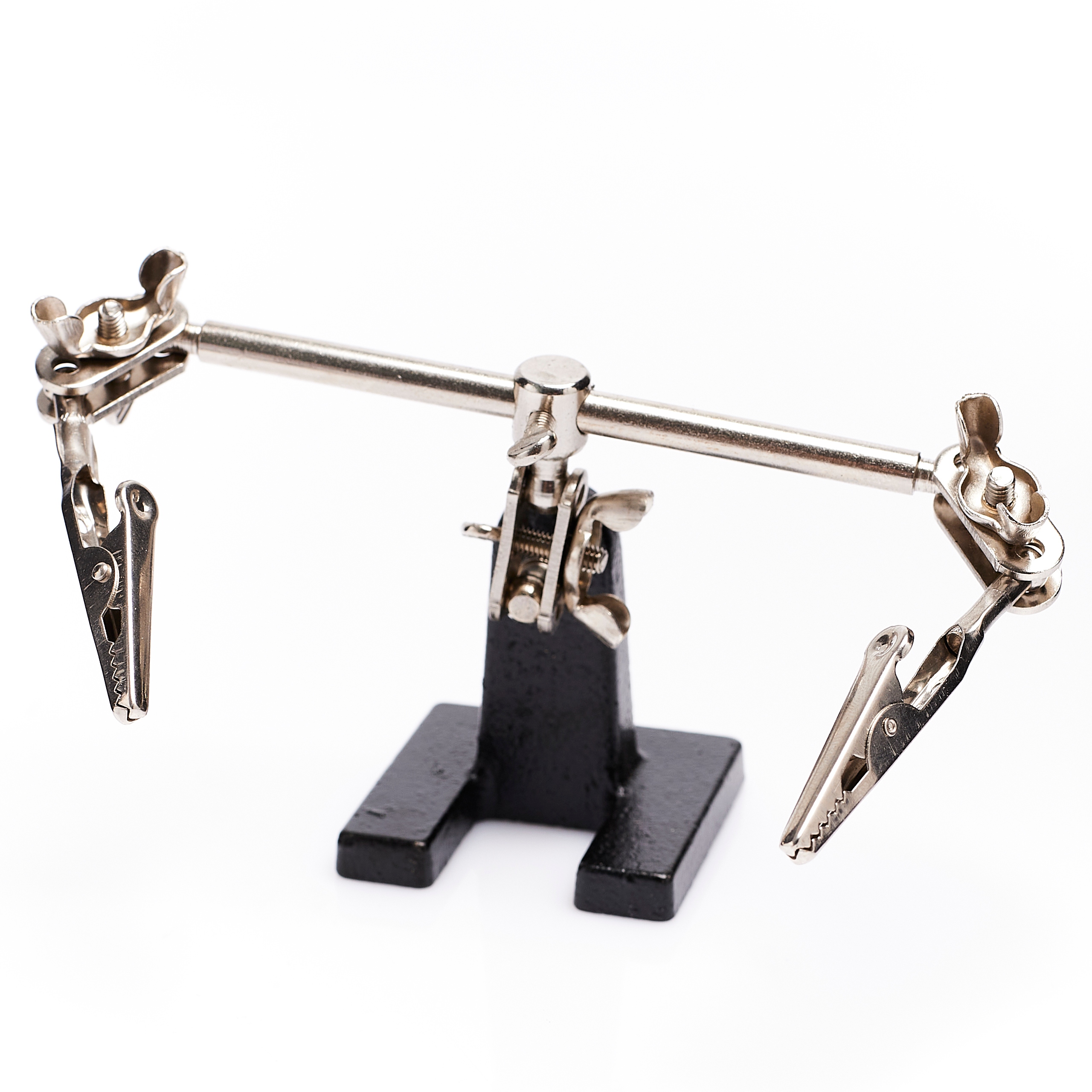 Doskonale sprawdzi się podczas wszelkich prac precyzyjnych, w jubilerstwie, modelarstwie.Idealne narzędzie do lutowania oraz wszędzie tam, gdzie brakuje "trzeciej ręki".Uchwyt wyposażony w dwa zaciski typu "krokodylek",regulowane pod różnym kątem i rozstawie, trzecia ręka wyposażona została w żeliwną podstawę dzięki czemu praca jest stabilna.