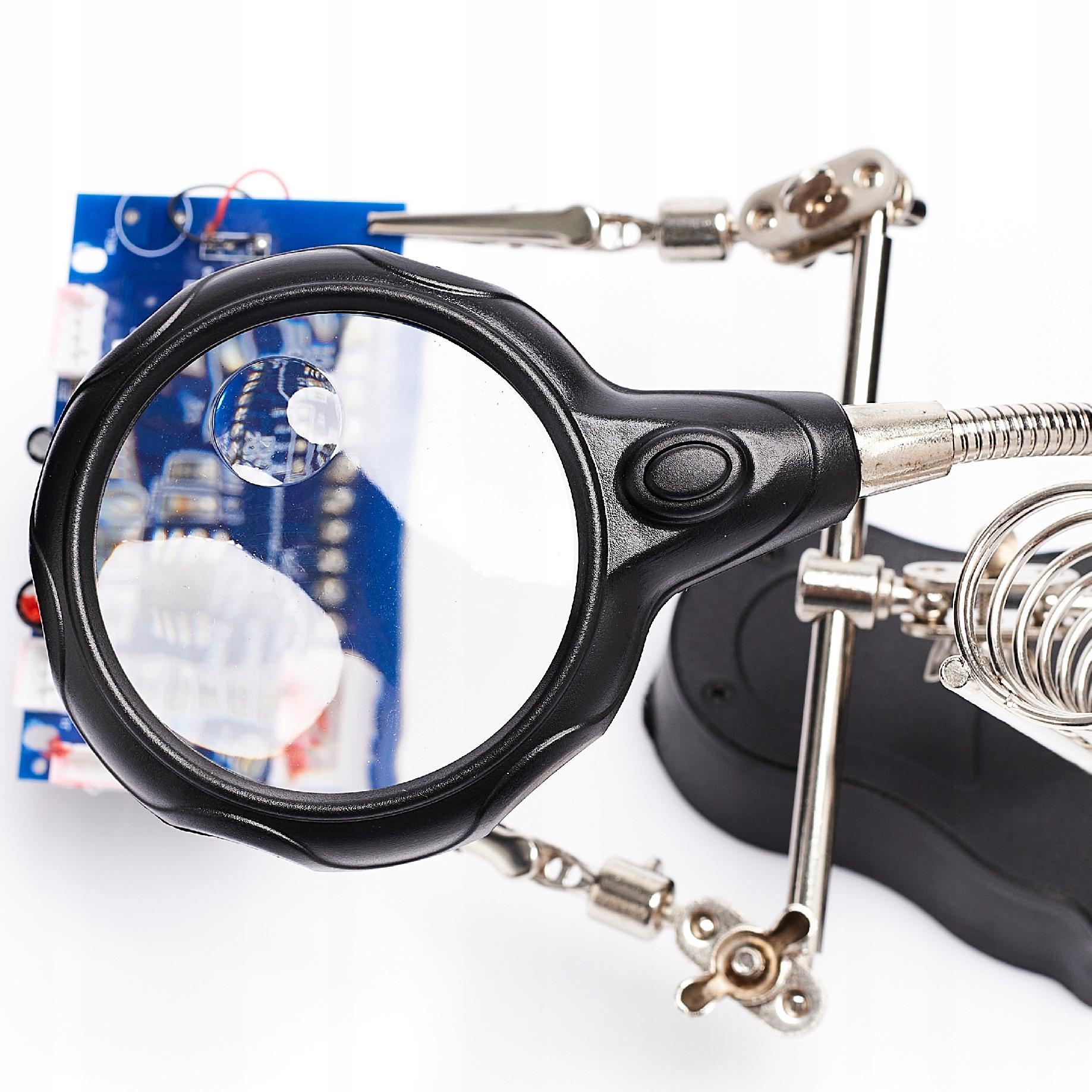 Uchwyt montażowy z lupą, podświetleniem LED, oraz uchwytem na lutownice