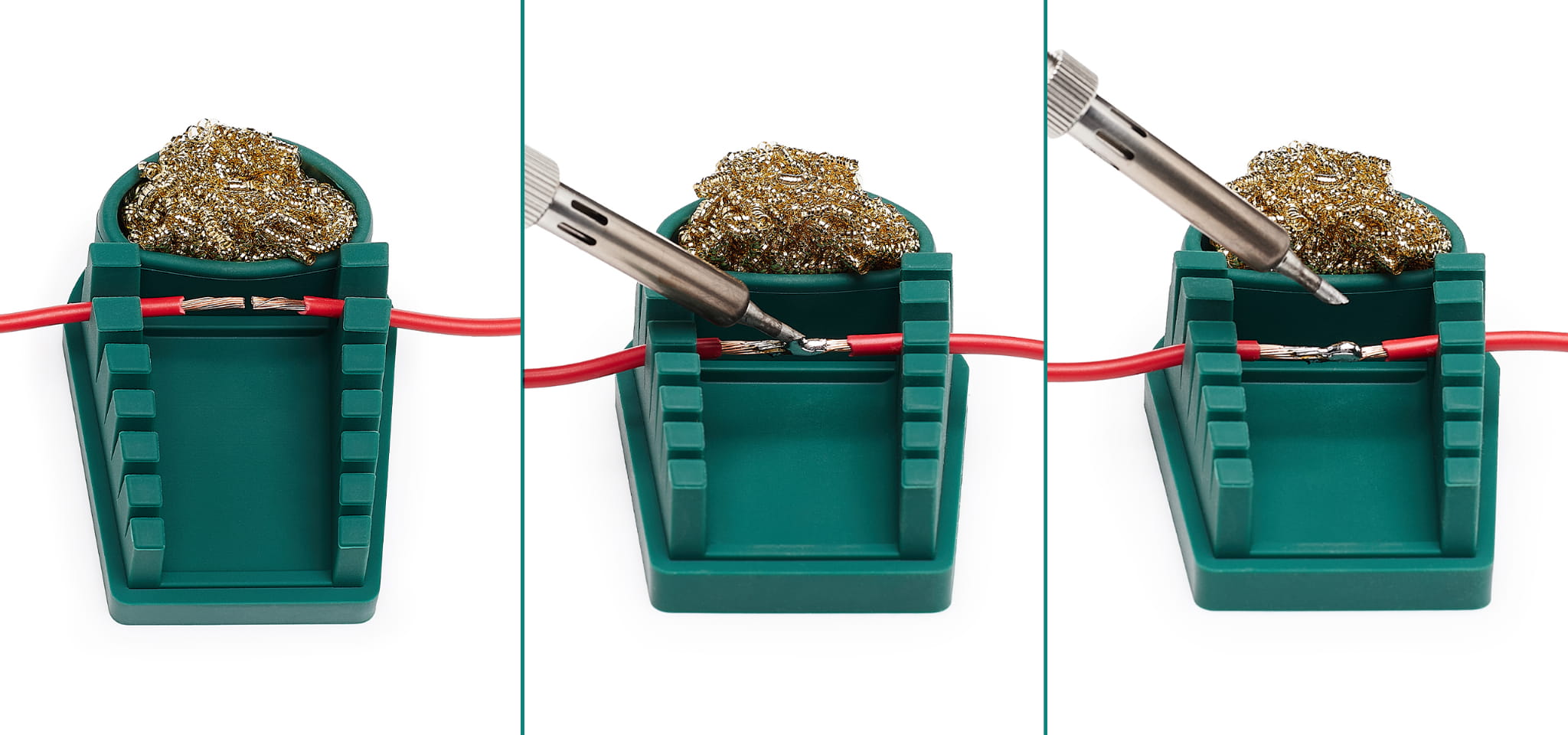 Dzięki sześciu uchwytom przewody pozostają nieruchome, co zwiększa precyzję lutowania. Różne rozmiary uchwytów pozwalają dopasować je do konkretnego kabla.