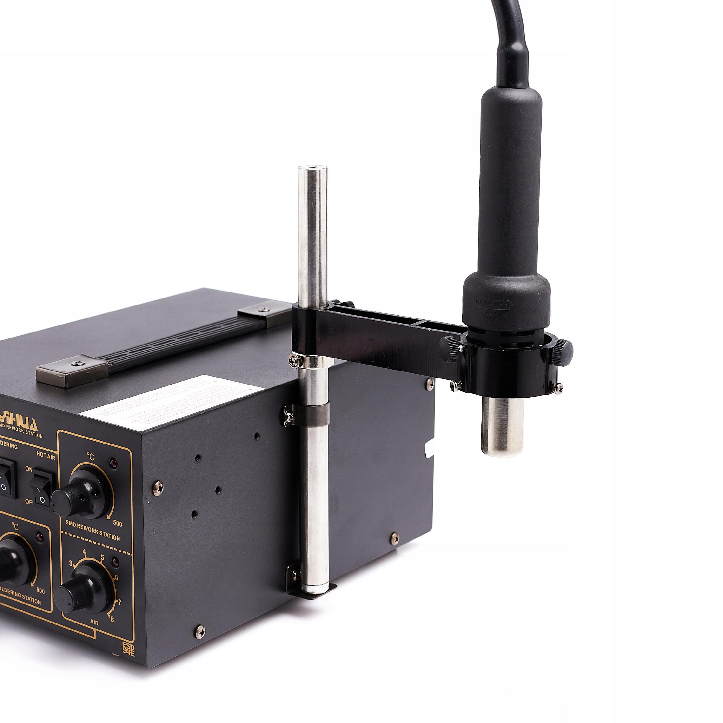 Uchwyt ma za zadanie utrzymywać kolbę do gorącego powietrza w wybarnej odległości, by nie doporowadzić do przegrzania, a równocześnie ułatwia prace serwisową, Uchwyt posiada regulacje wysokości kolby, dzięki niemu dostajemy swobodę pracy - obie recę pozostają wolne.