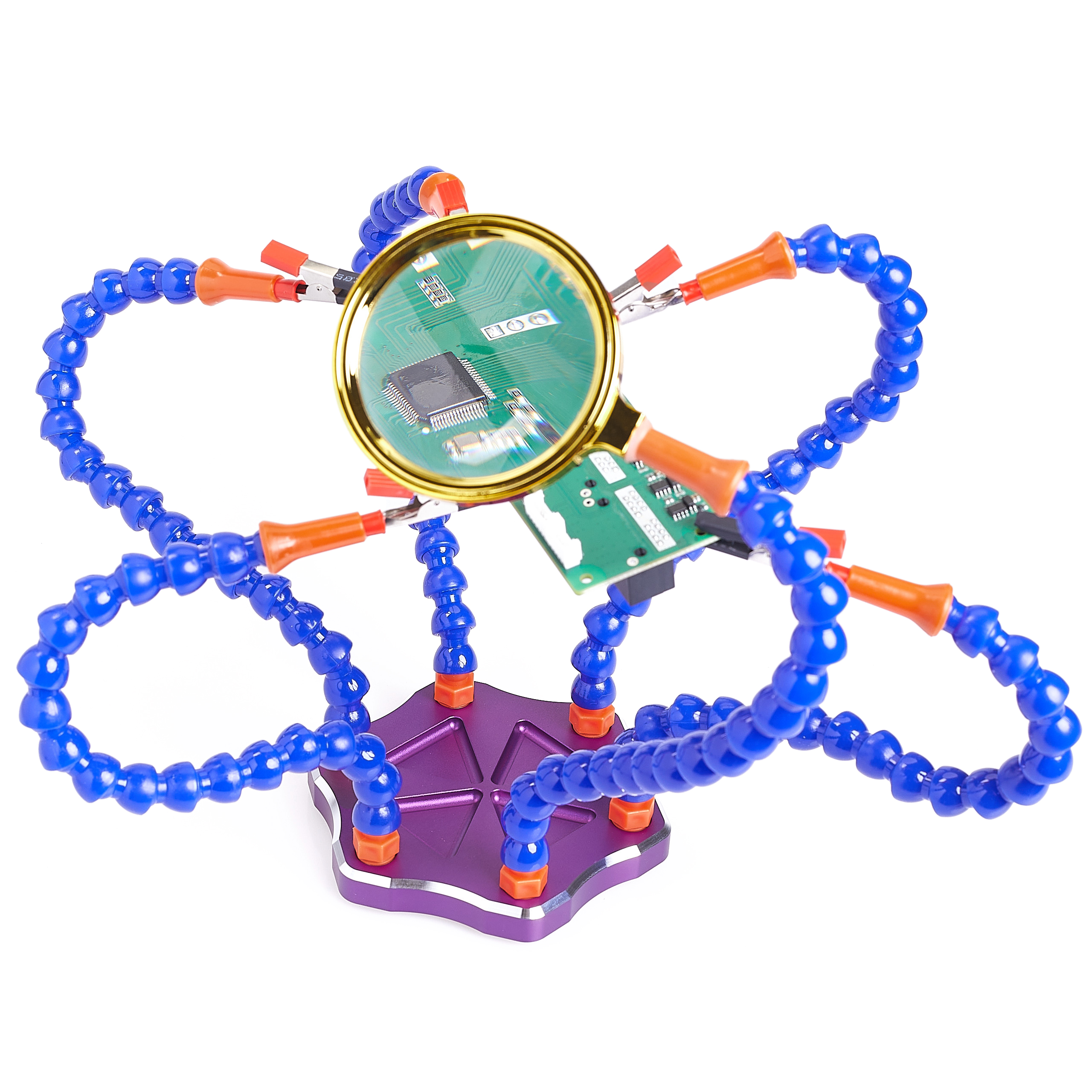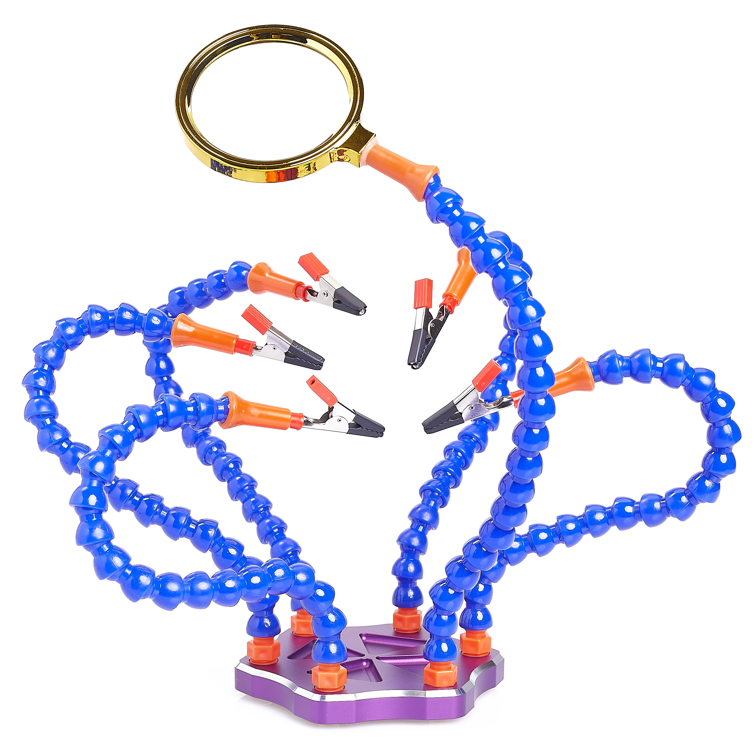 ✅Jest to niezastąpione narzędzie w pracy podczas napraw elektroniki . Doskonale sprawdza się w lutowaniu oraz innych pracach, gdzie dwie ręce nie wystarczą! 5 ramion oraz dodatkowe przeznaczone dla szkła powiększającego, wszystkie z zaciskami typu krokodyl, są zamontowane na metalowej podstawie z miejscem na przechowywanie drobiazgów, takich jak śruby. Zestaw ten gwarantuje dokładność i niezawodność w komfortowych warunkach