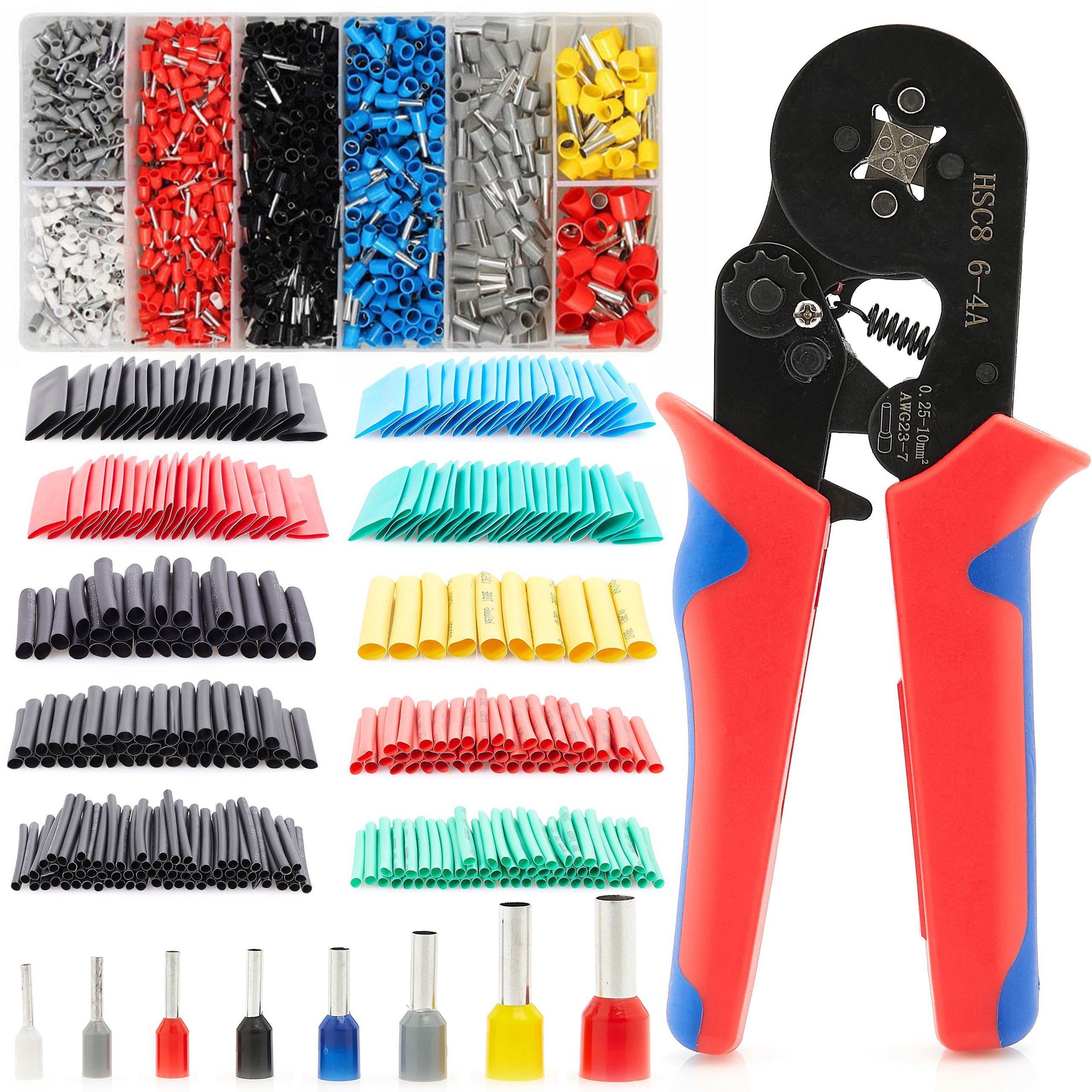Zaciskarka do tulejek + 1200 tulejek izolowanych + Zestaw rurek termokurczliwych 4 kolory / 8 rozmiarów 510szt.