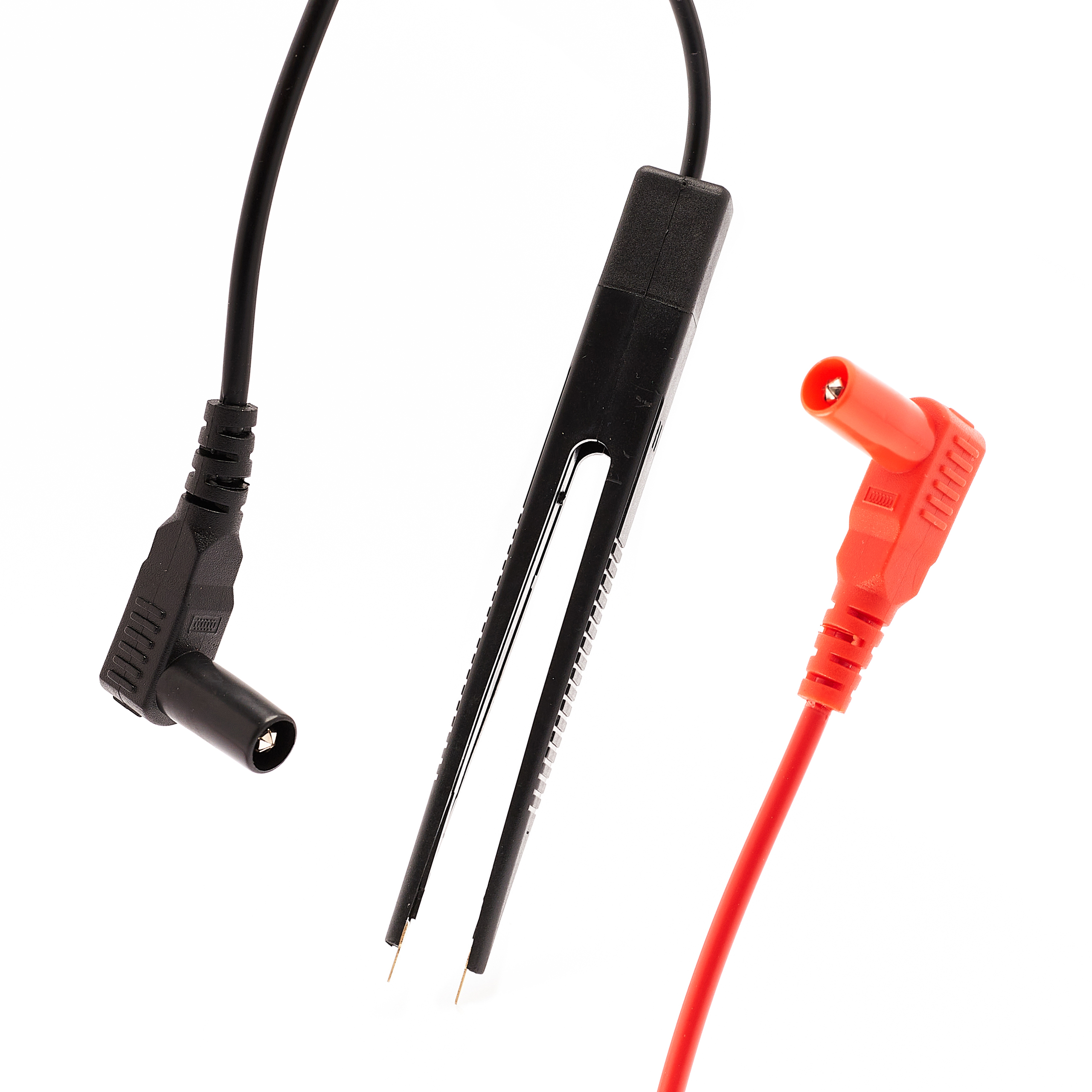 Z jednej strony przewody są zakończone kątowymi osłoniętymi wtykami bananowymi o średnicy 4mm , z drugiej pęsetą o długości 151mm. Wtyczki bananowe są zabezpieczone zaślepkami.