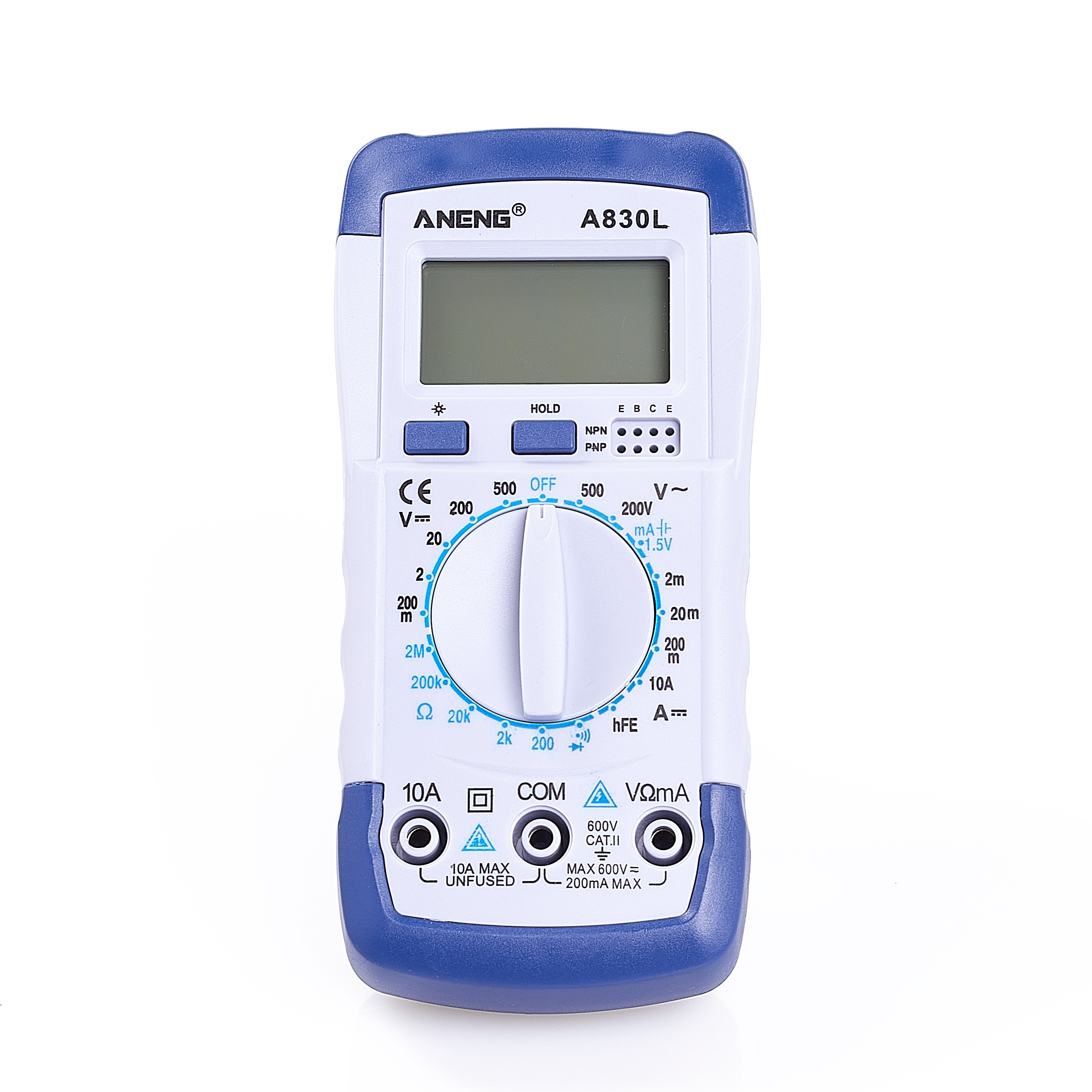 Multimetr Aneng A830L został wyposażony w tester diod, test ciągłości obwodu, funkcję hold oraz podświetlenie LCD.