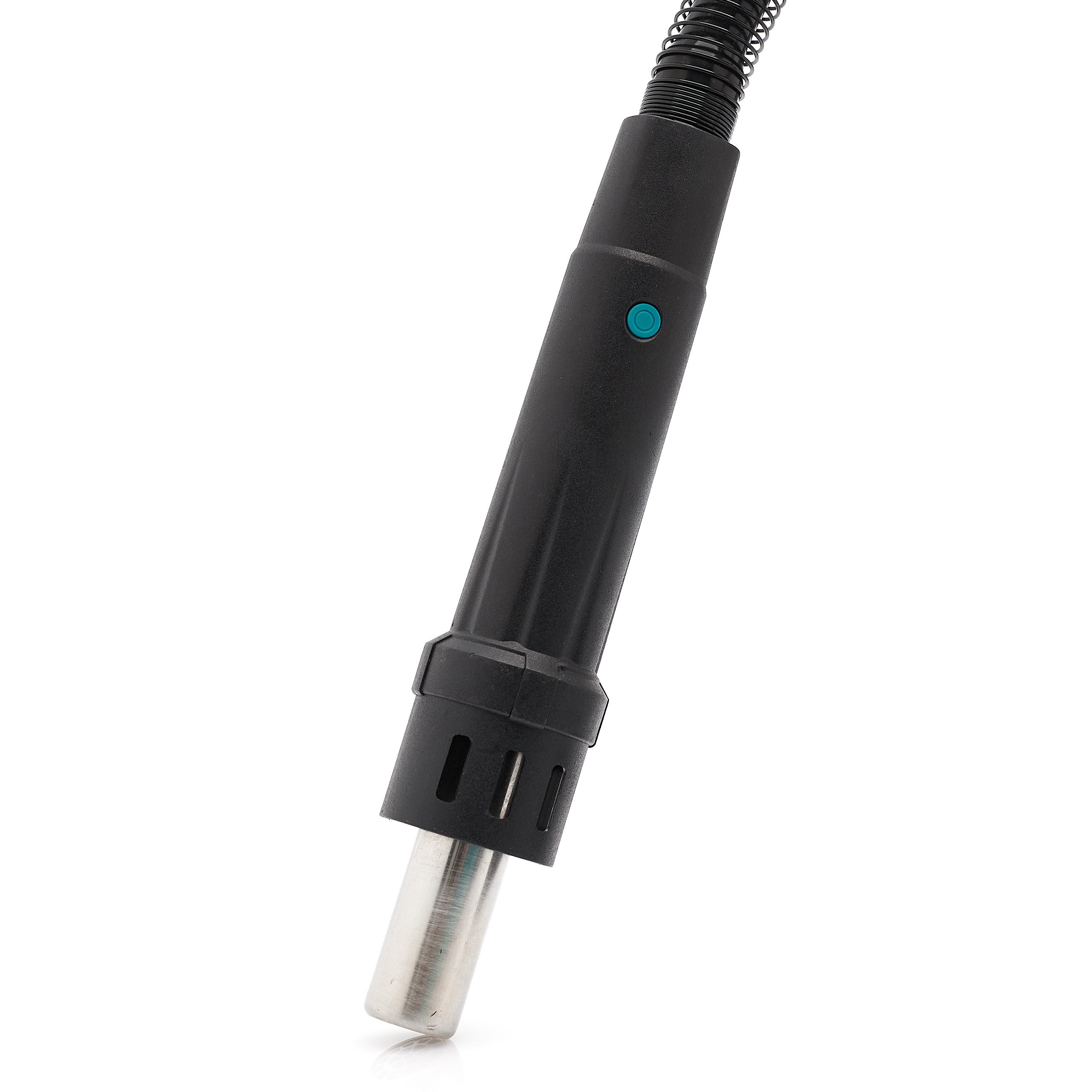 ❌ Dodatkowo dołożyliśmy przycisk, na kolbie gorącego powietrza, który pozwala na szybkie schłodzenie kolby do 70 stopni, po czym zaczyna dmuchać zimnym powietrzem, a na wyświetlaczu pojawia się napis COL, jest to bardzo przydatne rozwiązanie np. w przypadku rozprowadzania topnika po płytce, czy suszenia elementu, gdy nie chcemy go uszkodzić gorącym powietrzem (bardzo mało stacji posiada tą funkcję)