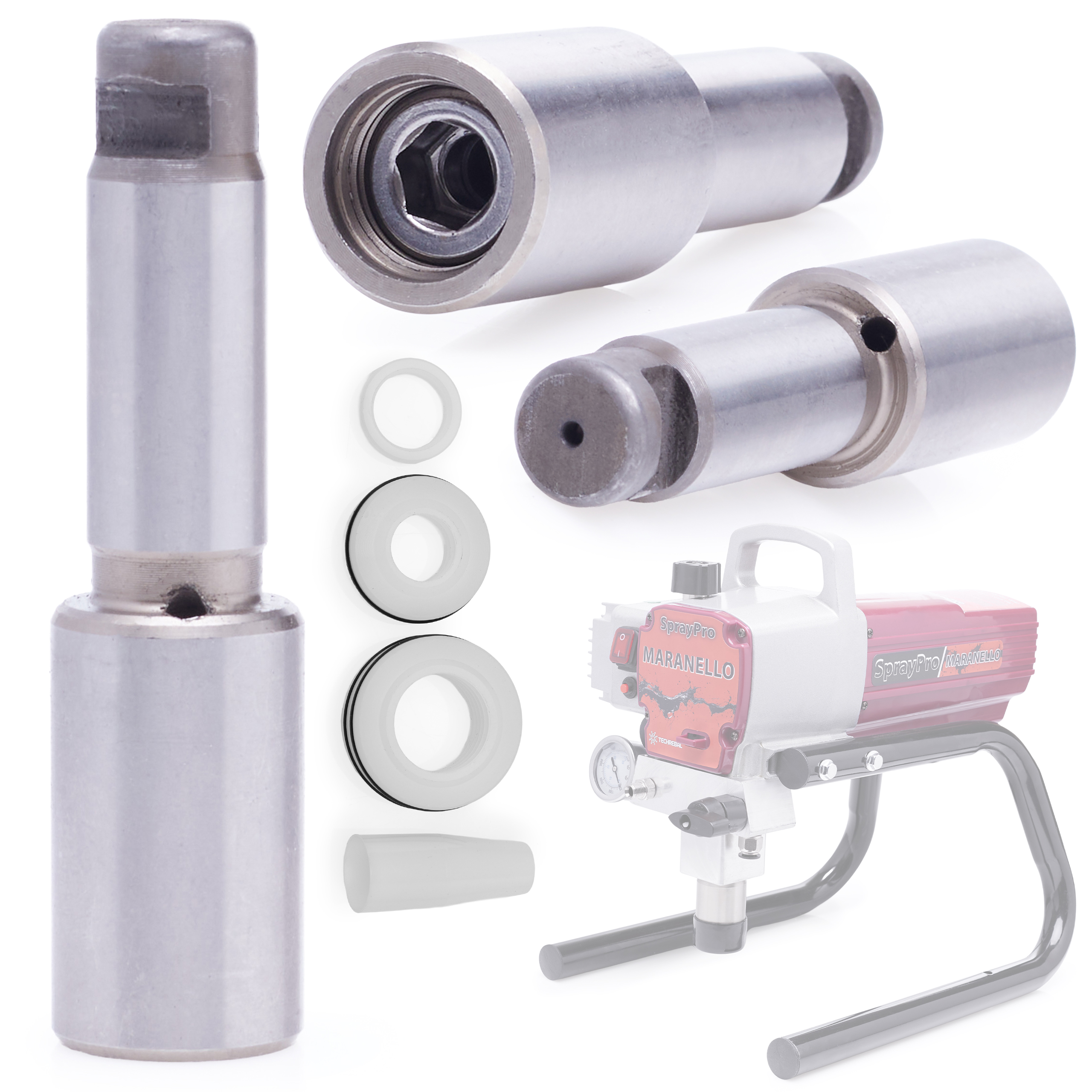 W zestawie znajduje się tłok wraz z uszczelkami, które odgrywają kluczową rolę w zachowaniu szczelności i prawidłowego działania agregatu. Dzięki nim unikasz strat ciśnienia i wycieków, co przedłuża żywotność urządzenia. Wysokiej jakości materiały zapewniają odporność na zużycie i działanie chemikaliów, co przekłada się na dłuższą, bezawaryjną pracę agregatu malarskiego.