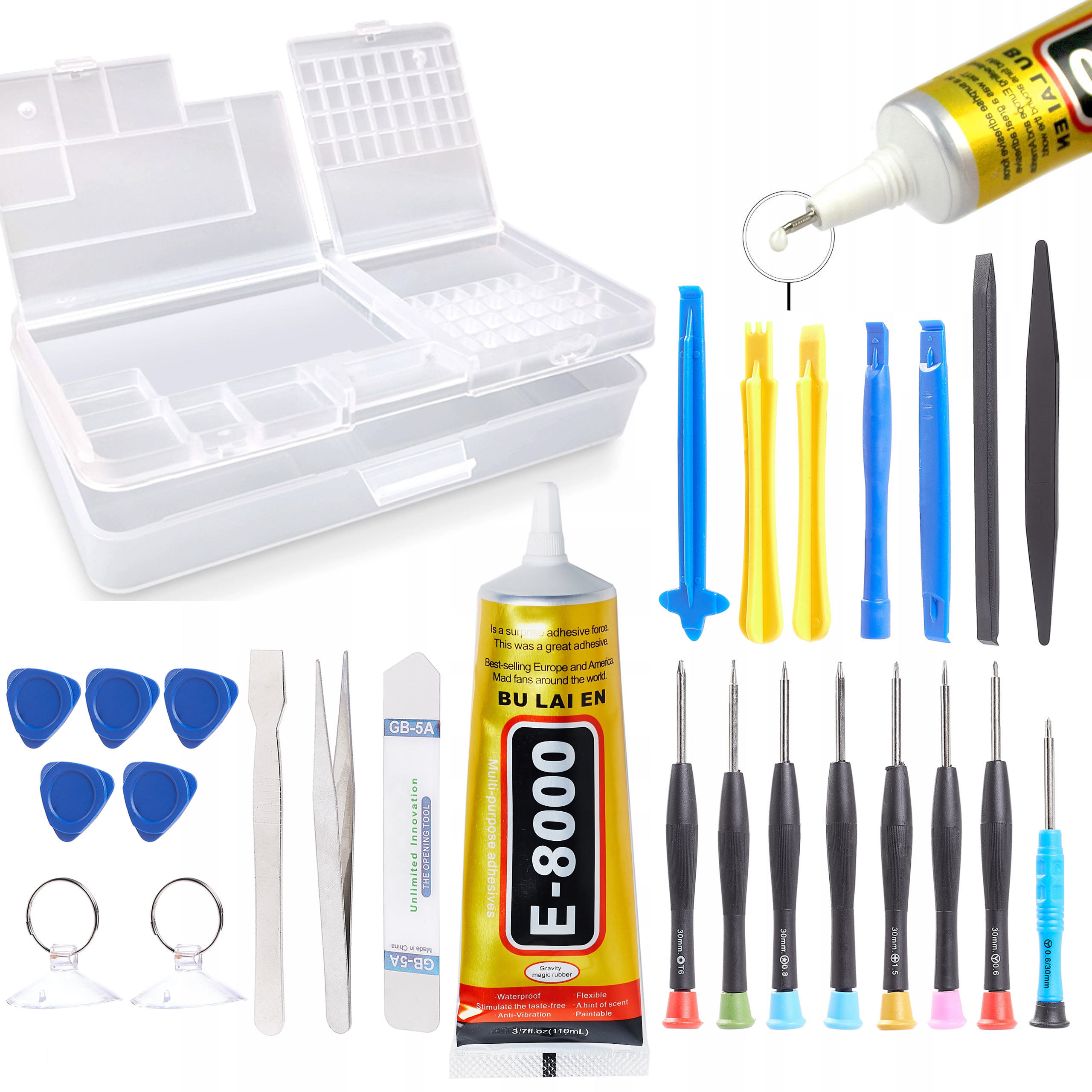 Zestaw Akcesoriów GSM Naprawa elektroniki 25w1 + Podwójny Box Etui + Klej E-8000 110ml