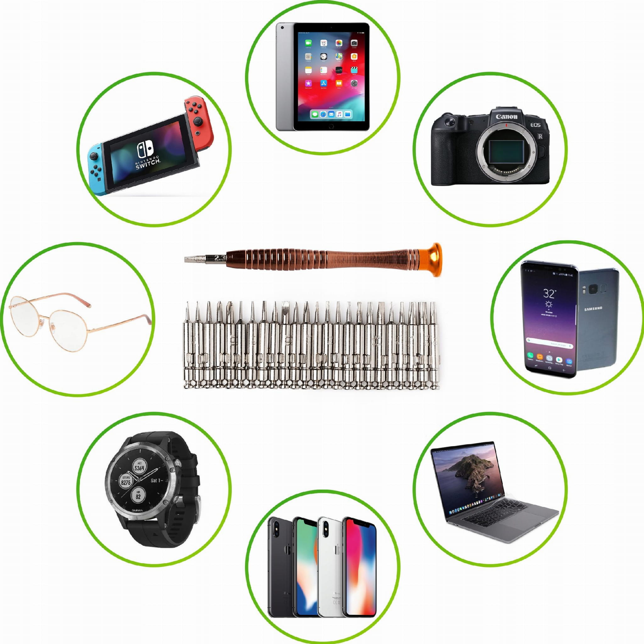 - Zestaw specjalistycznych wkrętaków to 25 elementów znajdujących się w etui zamykanym na magnes.