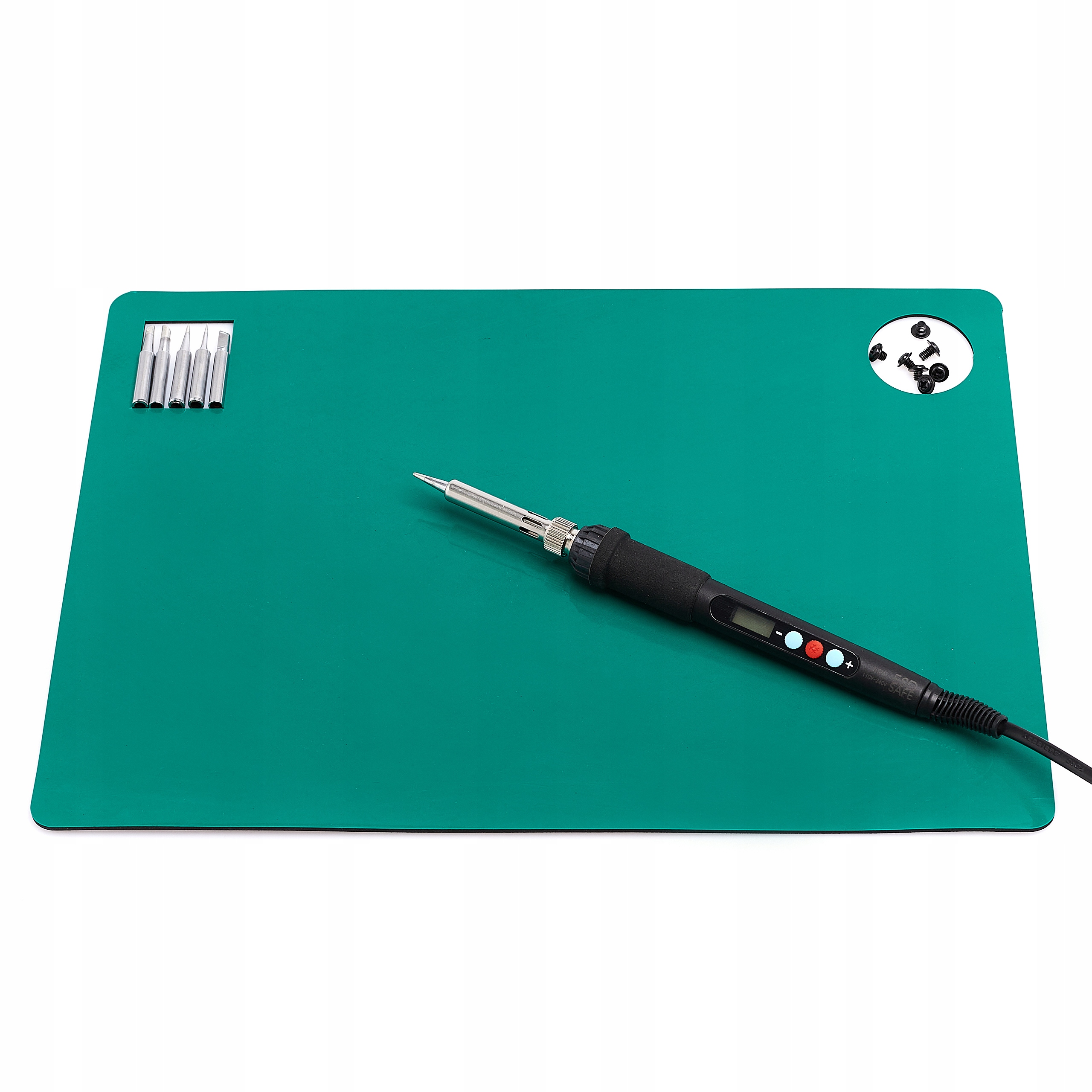 Wysokiej jakości mata antystatyczna. Gumowa powierzchnia robocza odprowadzająca ładunki elektrostatyczne od położonych na niej przedmiotów przewodzących. Chroni blat stołu i zabezpiecza wrażliwe elementy przed uszkodzeniem przez ładunki elektrostatyczne. Gładka powierzchnia, łatwa do utrzymania w czystości. Znajduje zastosowanie u elektroników oraz w serwisach komputerowych. Mata jest idealnie docięta, dzięki cięciu wykonanym przez maszynę CNC, podkładka znajdzie swoje zastosowanie w każdym serwisie.