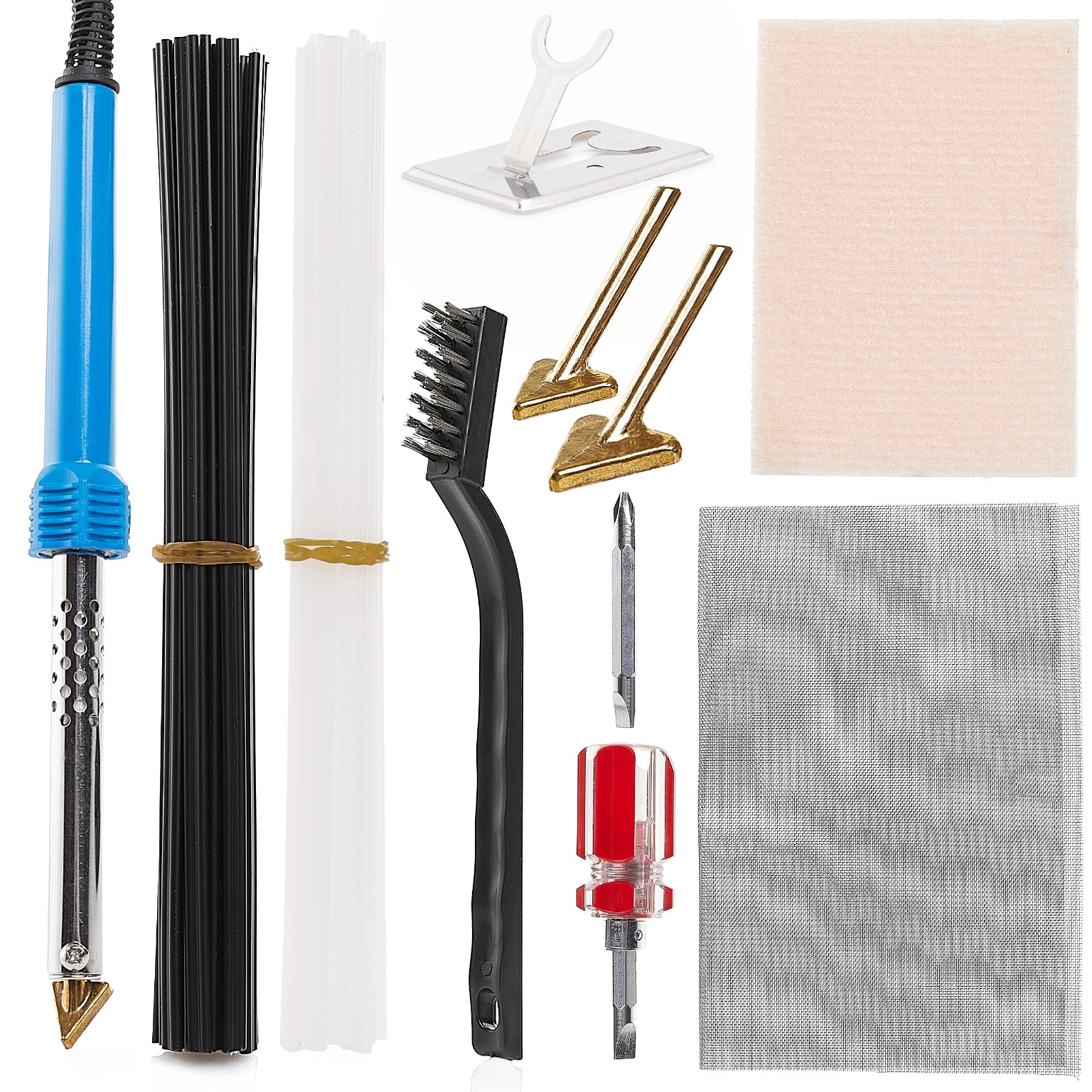 W skład zestawu wchodzi podstawowe białe spoiwo do spawania plastiku.